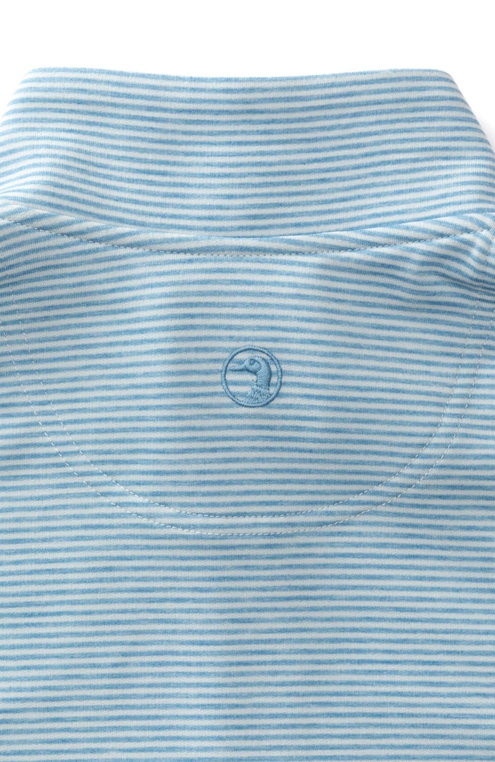 Introducing the Wakeman Stripe Performance 1/4 Zip by DUCK HEAD, a stylish long sleeve addition perfect for spring vacations. Made from 75% Repreve Polyester, 19% Lyocell, and 6% Spandex, this Lure Blue Heather top boasts a lightweight and moisture-wicking Heather Stripe French Terry design. Featuring a zip closure and an embroidered logo on the back yoke, it offers quick-dry and odor-resistant properties for convenient wear. This piece emphasizes both comfort and effortless style with its easy-care fabric, keeping you ready for any casual outing.