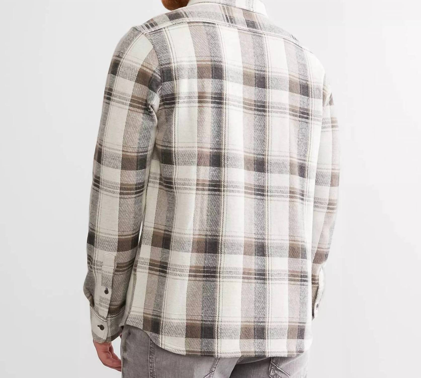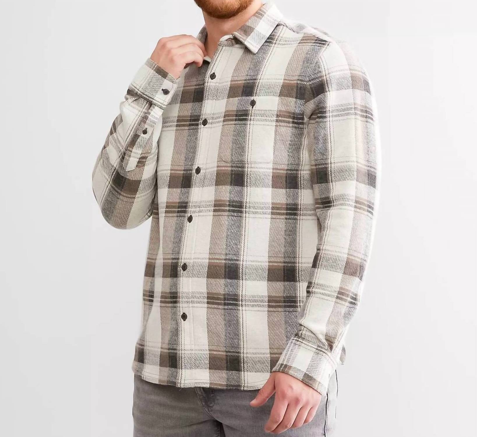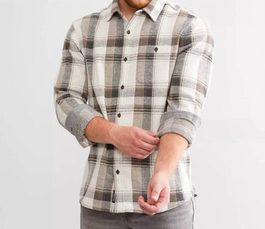 Introducing the Clearbrook Flannel Shirt by Flags & Anthem, a stylish men's casual button-down shirt in a cream and charcoal plaid pattern. Featuring long sleeves and a button closure, this shirt is crafted from a cotton blend of 42% Cotton, 36% Polyester, 20% Rayon, and 2% Spandex. The MadeFlex Performance Technology ensures built-in stretch and lightweight warmth for all-day comfort. Care instructions include machine washing cold and tumble drying.