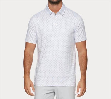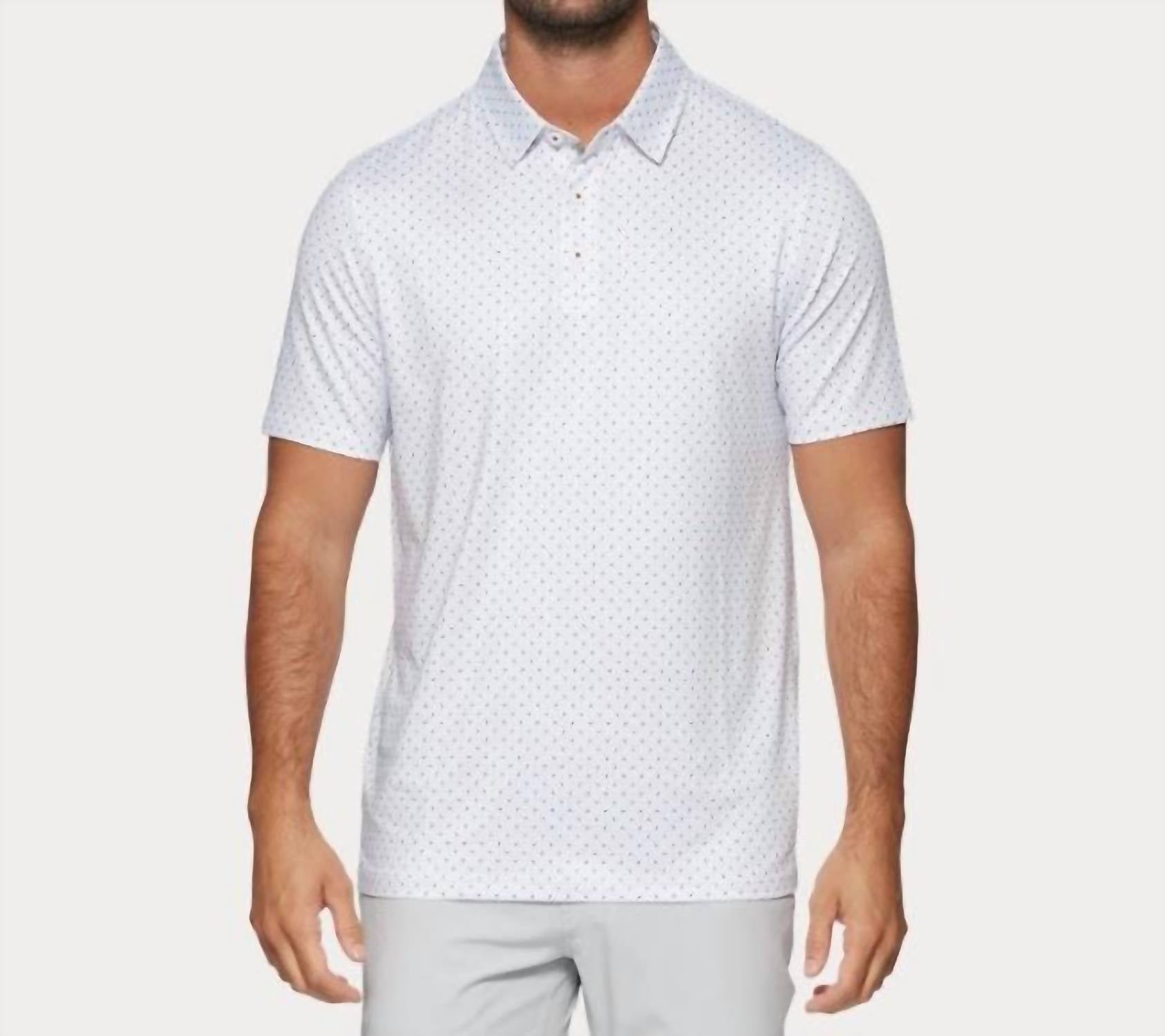 Elevate your style with the Montrose Star And Dot Print Polo by Flags & Anthem, designed for the modern man. This short sleeve polo in a white combo features a traditional three-button closure and is crafted from a smooth stretch jersey fabric. 89% Polyester, 11% Spandex. Imported with a tailored athletic fit and a length of 29.25 inches from the highest point of the shoulder. Machine wash. Model Ryan is 6'2", 185 lbs, and wears a size medium.