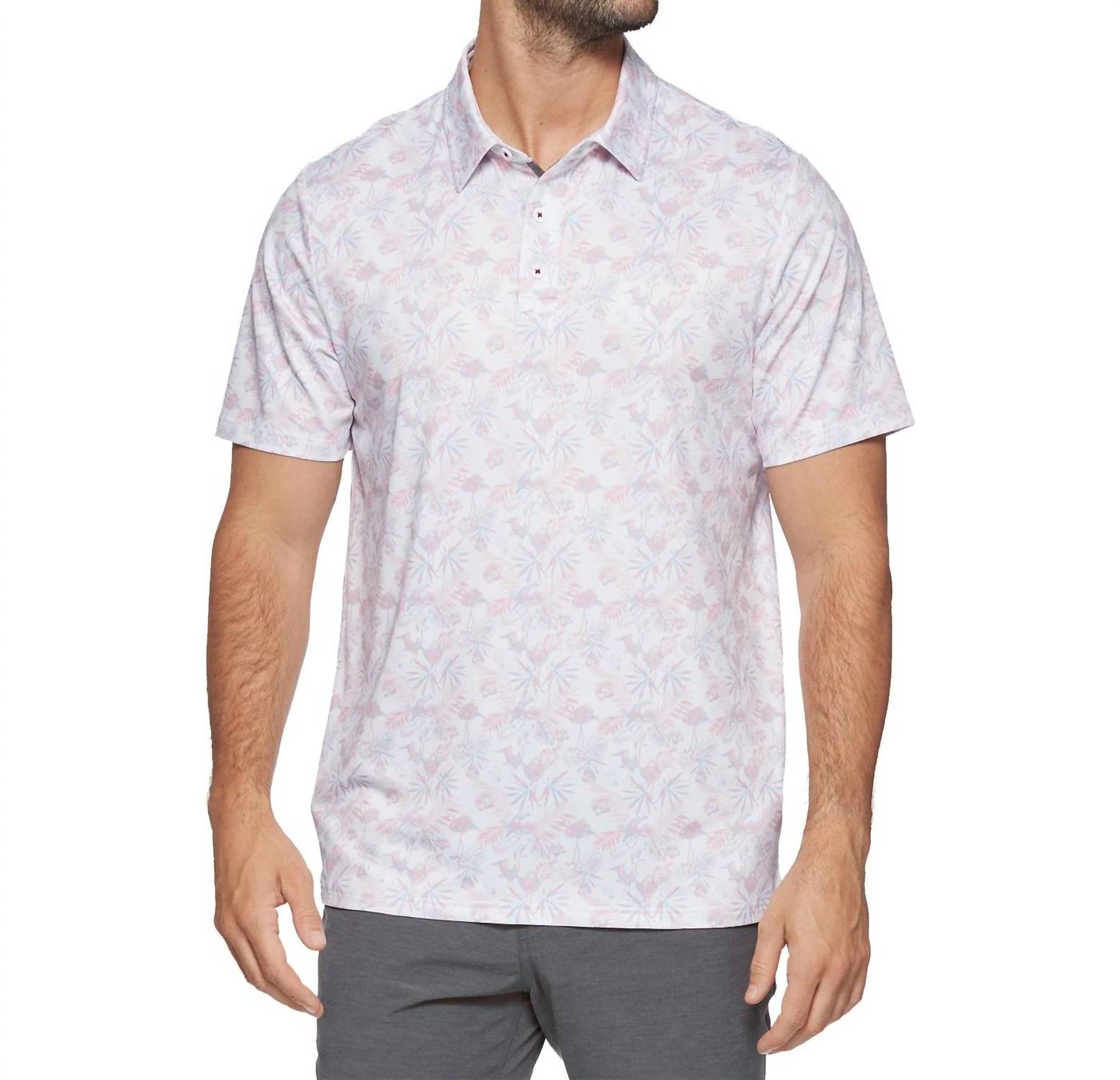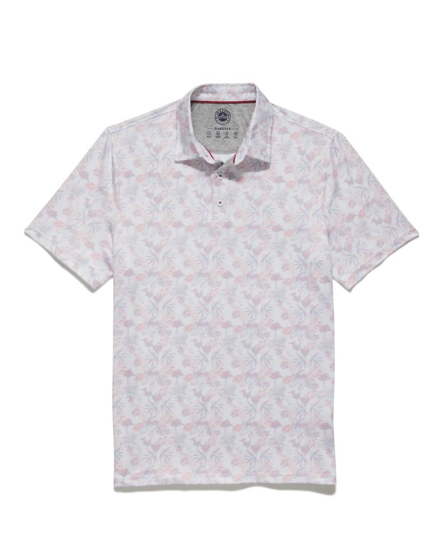Introducing the Pasadena Short Sleeve Toucan Print Performance Shirt by Flags & Anthem, expertly crafted for a stylish summer look. This men's shirt boasts a classic spread collar and a traditional three-button front placket, delivering a tailored athletic fit. Made from 89% polyester and 11% spandex, the fabric is designed with Built-In Stretch, Moisture Wicking, and UPF Protection for all-day comfort. Closure: Button closure. Care: Machine wash and tumble dry.