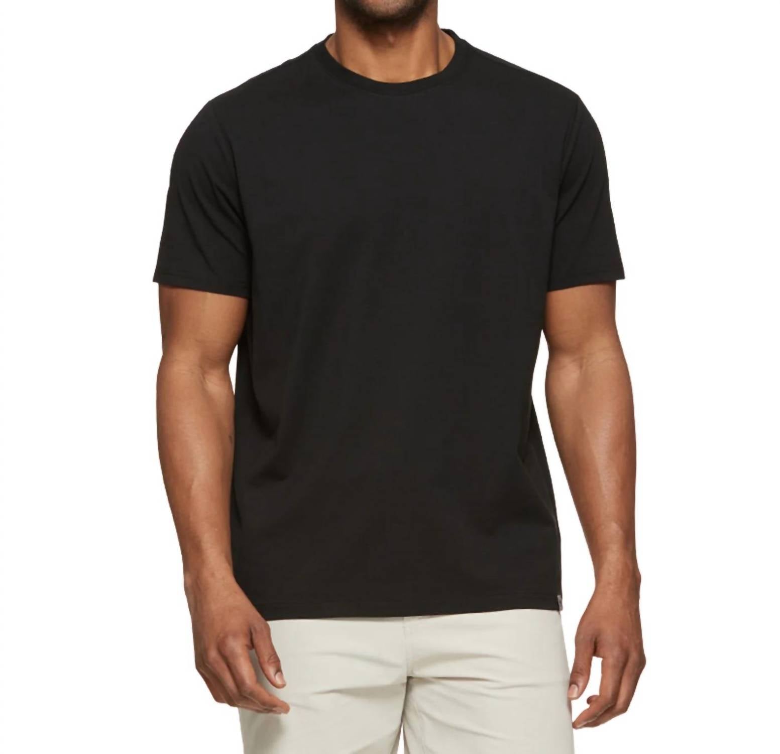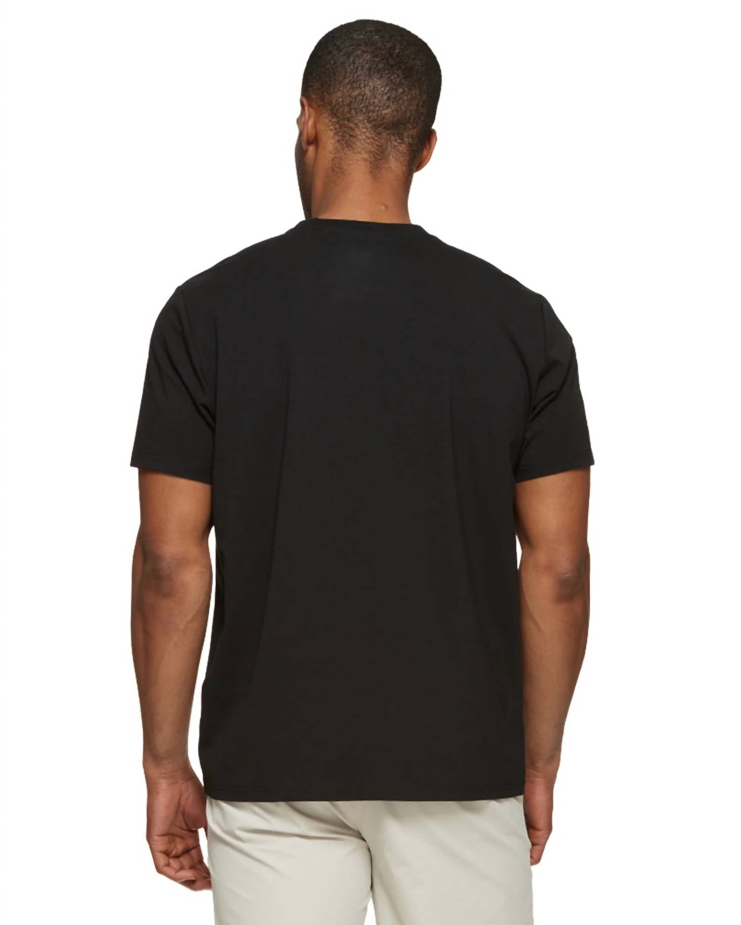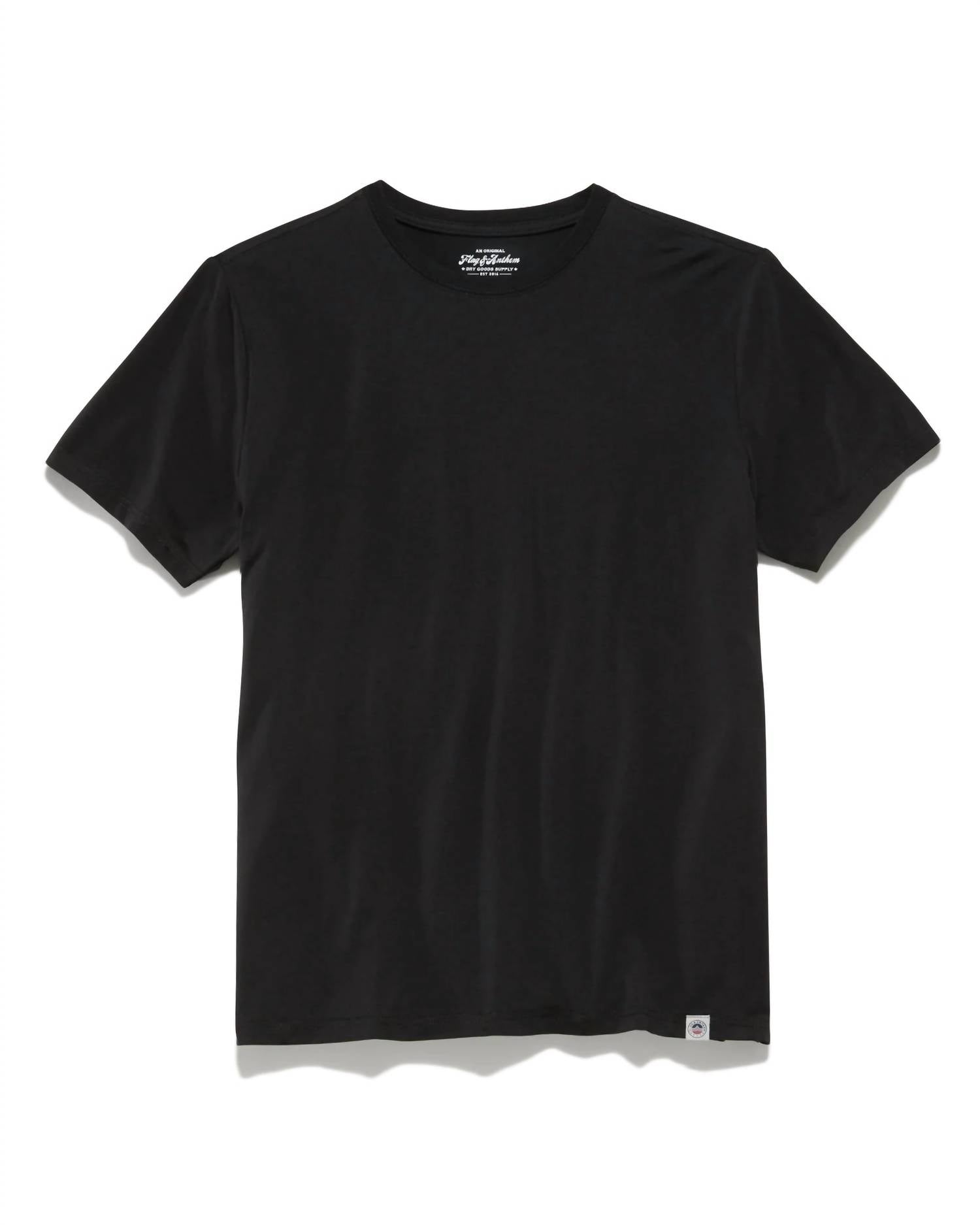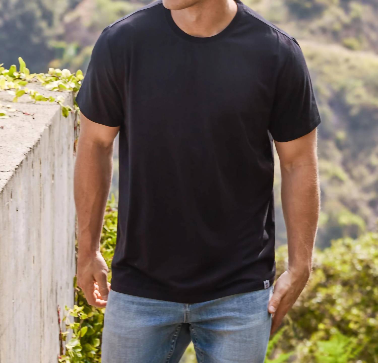 Discover the Syracuse Short Sleeve Crewneck Tee by Flags & Anthem, an essential piece crafted for everyday wear in solid black. This men's tee is composed of a premium lightweight cotton blend containing 69% Cotton, 25% Lyocell, and 6% Spandex, offering a tailored athletic fit. It features a versatile crewneck design with a pull-on closure. For easy care, simply machine wash and tumble dry. The garment measures 29.5" in length from the highest point of the shoulder.