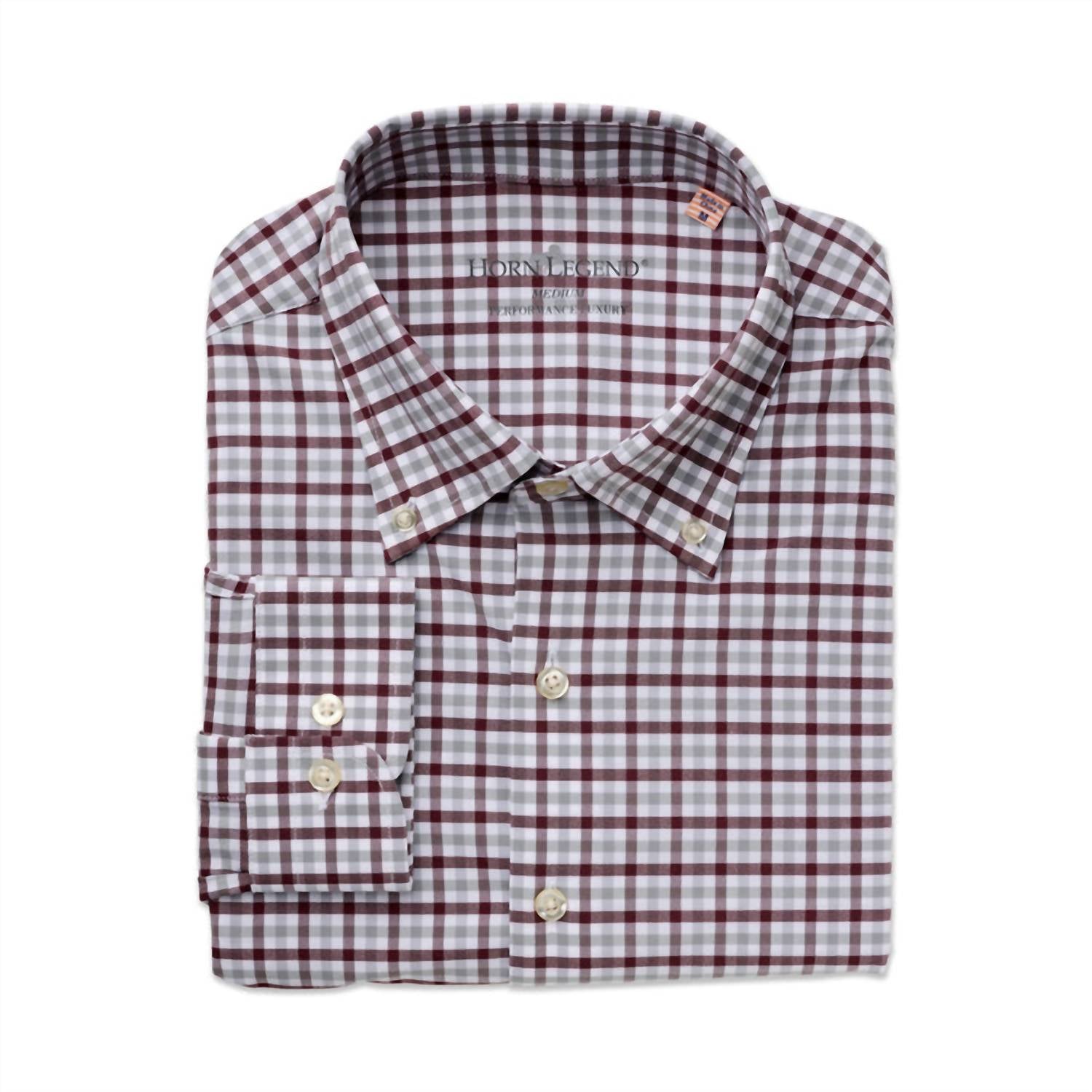 Discover the Men's Deep Ellum Performance Shirt by Horn Legend, crafted for both style and functionality. This long-sleeve sport shirt in a wine and grey plaid and check pattern features a collar and convenient button closure, making it perfect for vacations and casual western trends. Composed of 51.7% polyester, 36.5% nylon, and 11.8% spandex, it offers moisture-wicking and four-way stretch for enhanced comfort. Care is simple: machine wash cold with like colors and cool iron if needed, ensuring easy maintenance and long-lasting quality.