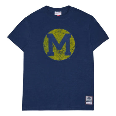 The Men's NCAA Legendary Slub Tee by Mitchell & Ness offers a nod to vintage style with its bold graphic wordmark and ribbed crewneck. Designed in a classic navy color, this short sleeve tee celebrates the University of Michigan with an athletic aesthetic. It's crafted for effortless wear with a pull-on closure.