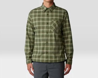 Blends classic button-up flannel style with modern sustainability and performance, designed for hiking, travel, and camping. Made from 95% recycled polyester and 5% elastane. Offers just the right amount of stretch for comfort and mobility. With a drop tail hem for easy layering, a buttoned chest pocket, and center front button closure. With an MHW flag label at the lower left seam.