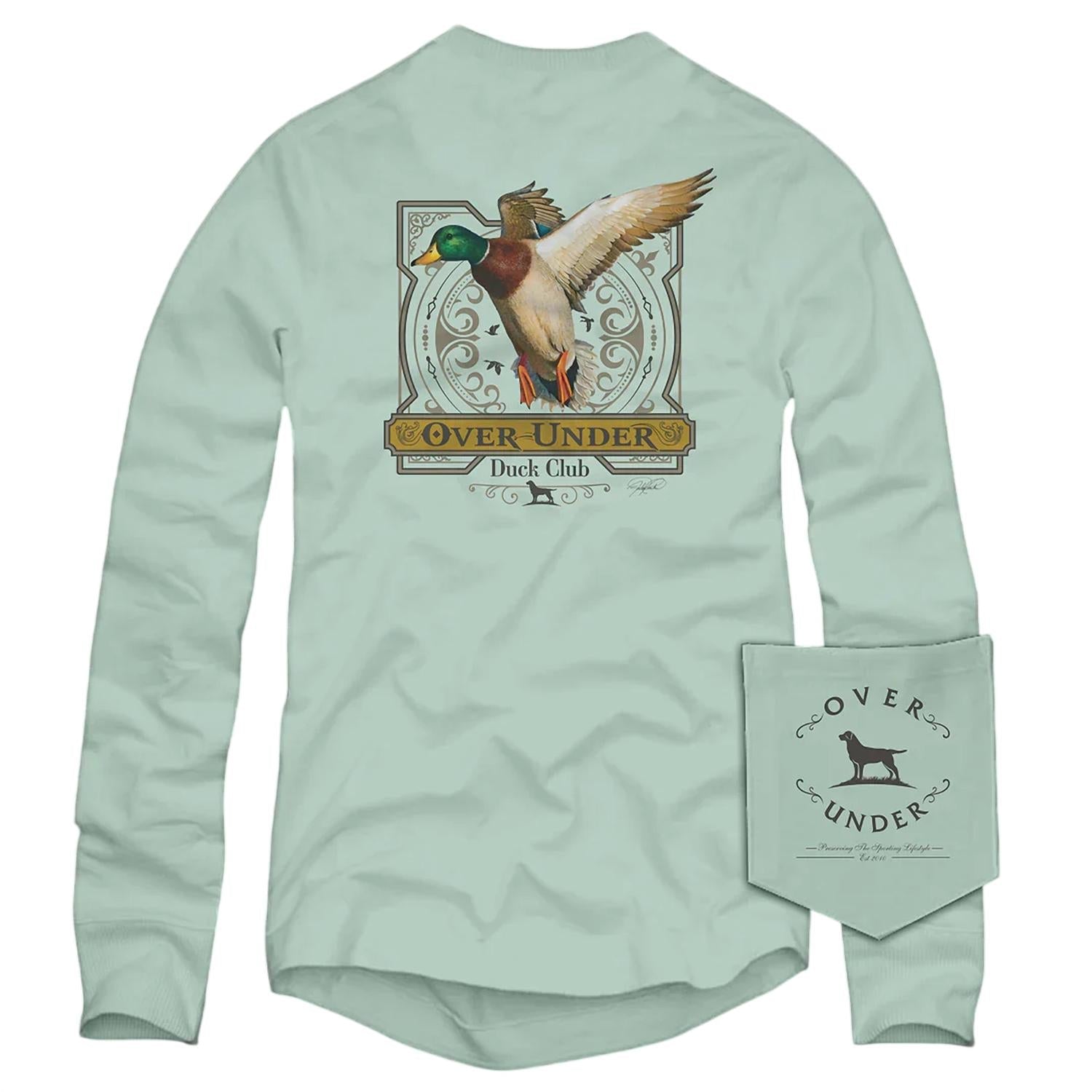Introducing the Men's Duck Club Long Sleeve Tee by Over Under, a tribute to outdoor enthusiasts. This Green Tea colored tee is crafted with long sleeves, composed of 100% cotton fabric, offering a soft and breathable fit. It features a pull-on closure and comfortable Lycra neck and wrist cuffs, designed to endure any adventure. Easy to care for, simply machine wash and tumble dry for effortless maintenance. Perfect for a day in nature or casual wear, this tee celebrates the essence of the woods and water with effortless style.