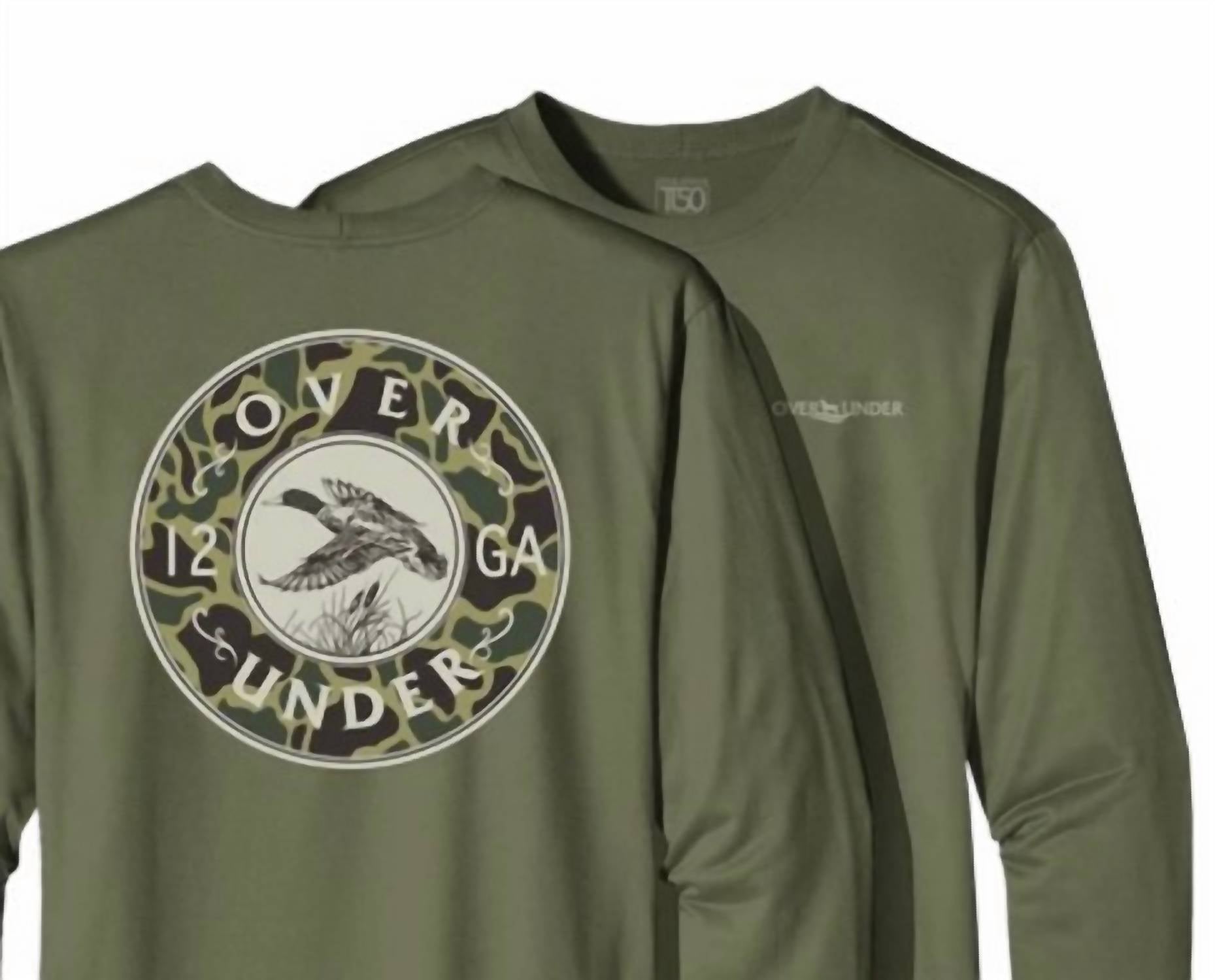 Introducing the Over Under Mallard Shot Long Sleeve Tee in a sophisticated moss hue, perfect for any outdoor enthusiast. This graphic tee features long sleeves and a crewneck, crafted from soft cotton for ultimate comfort. Closure: Pull on. Perfect for everyday adventures, this shirt is designed with water-based ink graphics that celebrate the outdoor sporting lifestyle.