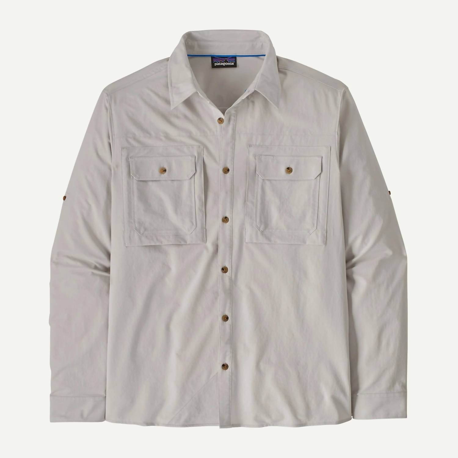 The Men's Self Guided Sun Shirt by Patagonia is a versatile long-sleeved shirt in crisp grey, perfect for outdoor adventures. Made from 100% recycled polyester, this shirt offers quick-drying comfort and a UPF 40+ sun protection, enhancing its performance under the sun. Designed with a button closure and practical features such as vertical chest pockets with corrosion-resistant zippers and a stand-up collar for added sun protection, it is made in a Fair Trade Certified™ factory in Vietnam. Weighing 244 g (8.6 oz), this is an essential piece for those who value sustainability and style.