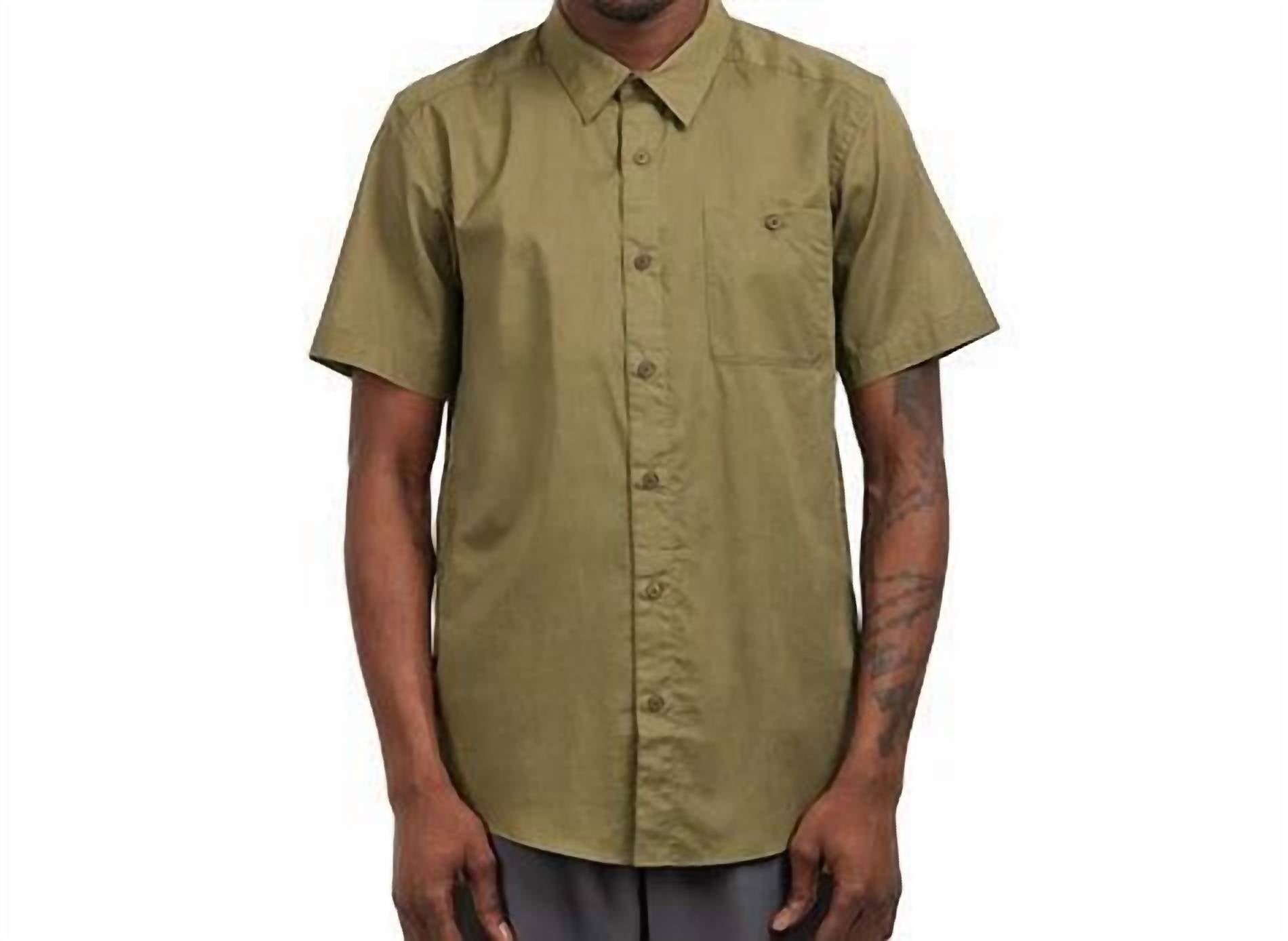 The Men's Sunrise Stream Shirt by Patagonia is a perfect blend of style and sustainability, crafted from 100% organic cotton for breathable, warm-weather comfort. Featuring short sleeves and a classic turned-down collar, this Tent Green shirt provides effortless chic. It includes a button-front closure with unique coconut buttons and a practical left-chest pocket. Proudly made in Vietnam within a Fair Trade Certified™ factory, it supports ethical manufacturing. Easy to maintain, you can machine wash and tumble dry this lightweight 130 g (4.6 oz) piece, making it ideal for any minimalist's dinner party or Thanksgiving attire.