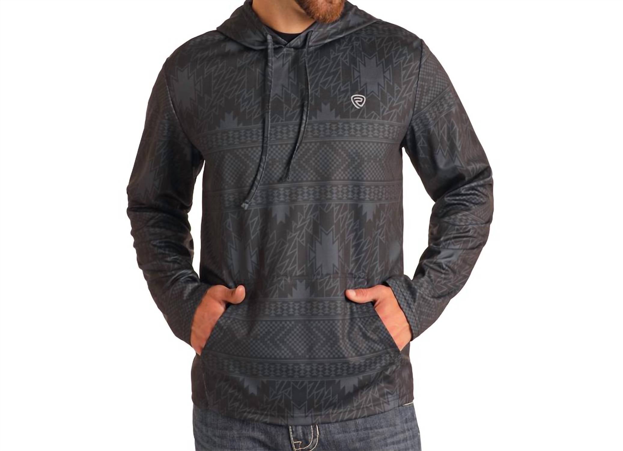 Introducing the Performance Aztec Lightweight Hoodie by Rock & Roll Denim, a stylish piece perfect for any casual outing. Crafted with long sleeves and 100% polyester, this hoodie features a breathable, moisture-wicking, and quick-dry fabric that boasts UPF 50+ protection. It includes a convenient pull-on closure with a practical drawstring hood and kangaroo pocket for added functionality. Designed in a striking black patterned style, it is machine washable and suitable for tumble drying, making it ideal for active wear.