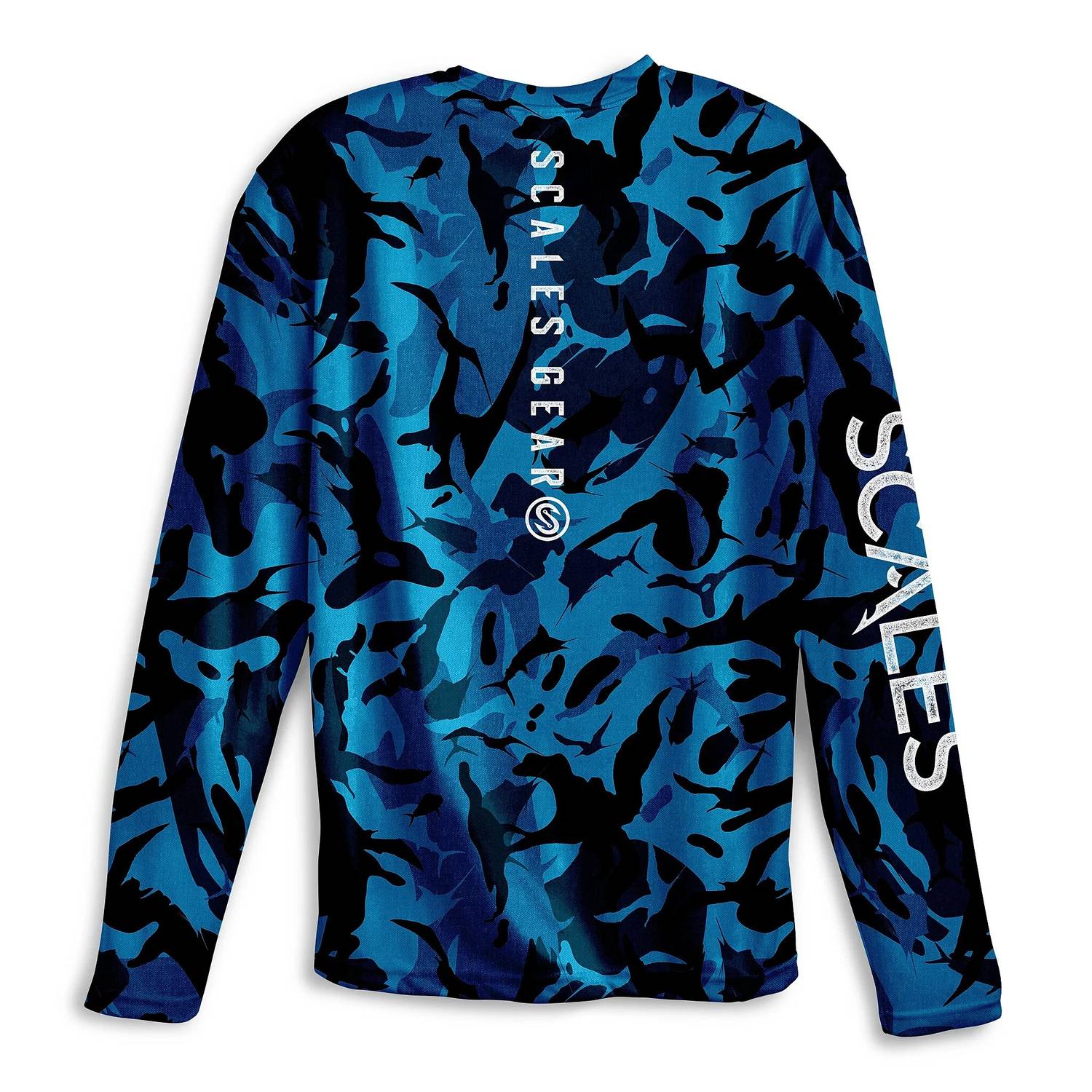 Introducing the Frigate Camo Pro Performance Tee by Scales, crafted for the active man with long sleeves and a graphic pattern in Blue Camo. Made from 100% recycled water bottles, this tee offers advanced moisture-wicking, quick-drying, and anti-microbial properties with UPF 50+ sun protection. Closure type is pull on, designed for ease of wear. Care: Hand wash only. Featuring thumb holes and an athletic fit, this shirt ensures comfort and practicality for your sun-filled adventures.