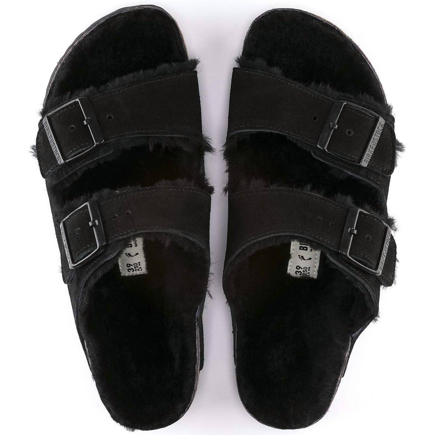 This cozy version of a classic sandal is made for colder weather, with a soft outside and warm, fluffy lining on the inside—even on the footbed. The footbed shapes to your foot over time for extra comfort and support. It has two adjustable straps with metal buckles for a secure fit, and a lightweight, flexible sole that’s easy to walk in, whether you're indoors or outside.