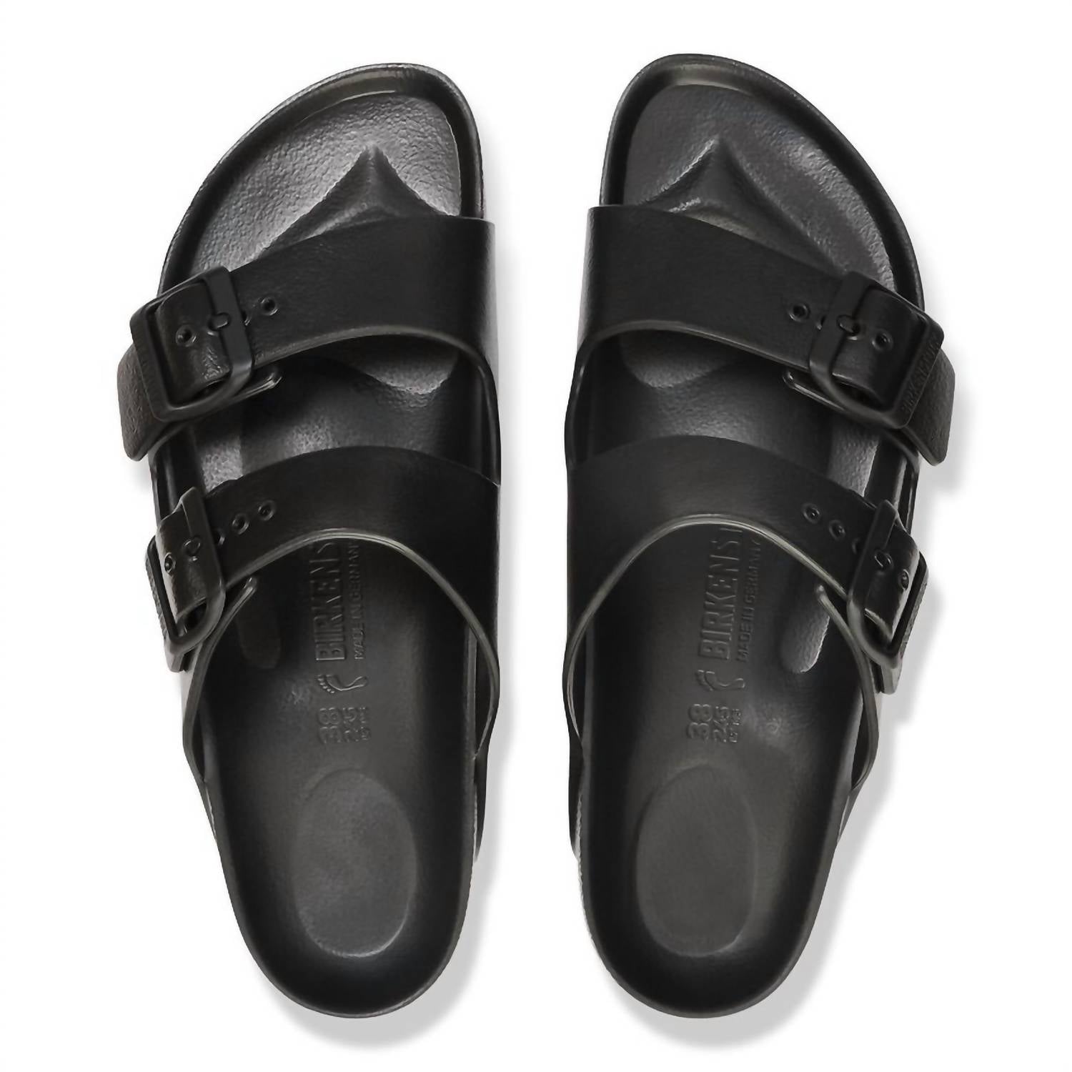 Step into comfort with the Unisex Arizona Eva Sandals by BIRKENSTOCK, featuring a legendary two-strap design in sleek black. Made entirely from ultra lightweight, highly flexible EVA rubber, these sandals are waterproof and skin-friendly, perfect for beach trips or gym sessions. They boast an anatomically shaped footbed and two adjustable pin buckles, ensuring a perfect fit. Crafted with precision in Germany, they exemplify comfort and style.