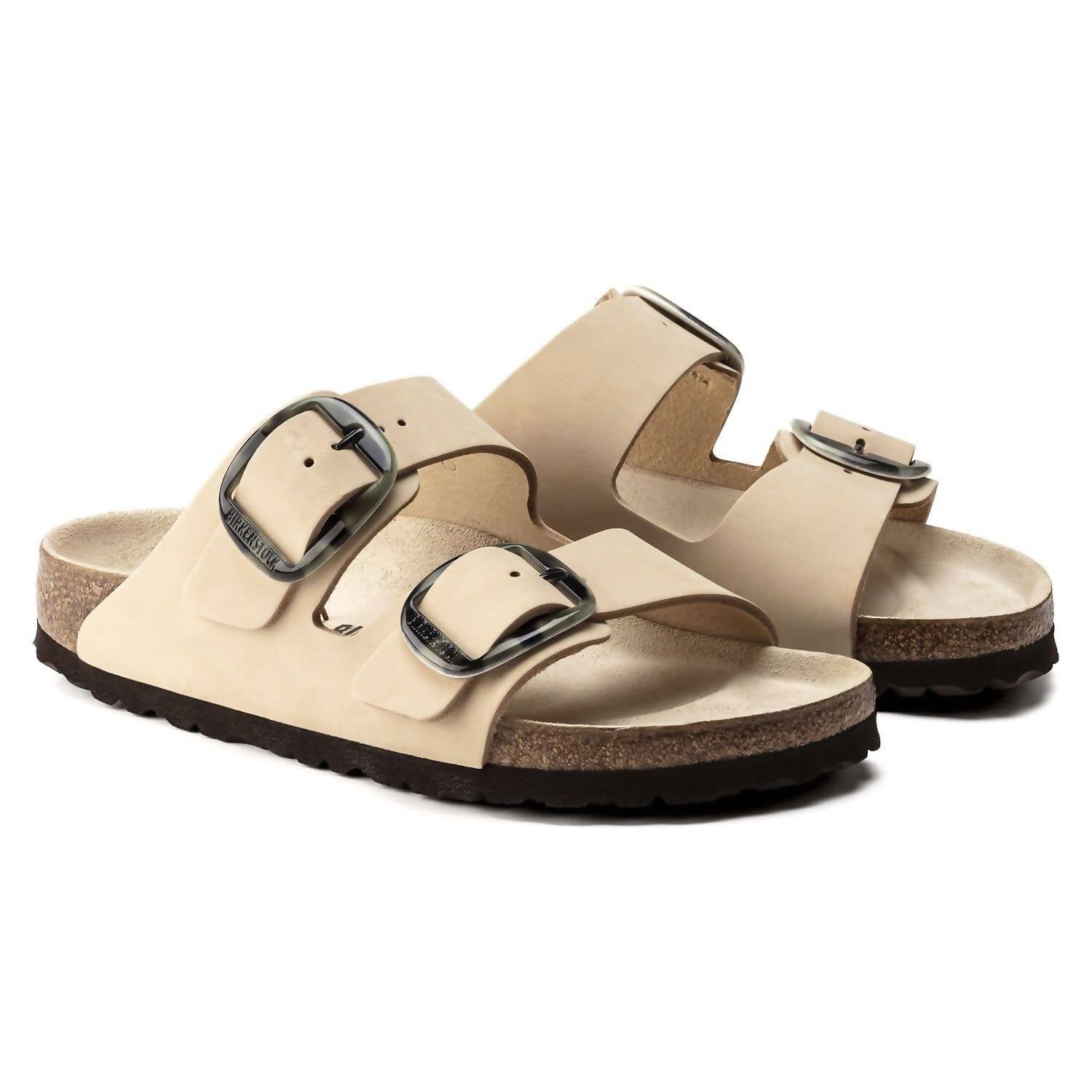 The Women's Arizona Almond Big Buckle Sandals by BIRKENSTOCK offer a chic twist on the iconic two-strap design, now with a striking large buckle for a bold yet minimalist appeal. Crafted from beige nubuck leather, these sandals feature an anatomically shaped cork-latex footbed for comfort and support, lined with soft suede, and boast a durable EVA sole. Each strap supports an individually adjustable pin buckle for a customizable fit. Made in Germany, these sandals are perfect for summer vacations, offering both style and comfort in a flat, open-toe design.