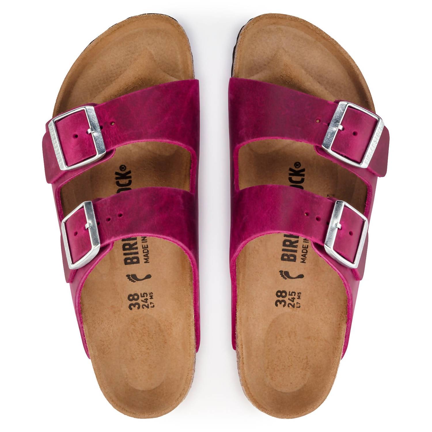 Embrace legendary comfort and style with the Women's Arizona Oiled Leather Sandals by BIRKENSTOCK in striking Festival Fuchsia. These sandals feature an anatomically shaped cork-latex footbed and an oiled leather upper, uniquely designed to age beautifully over time. Made in Germany, the pair includes two adjustable straps with metal pin buckles for a customizable fit. The EVA sole ensures lightweight cushioning, perfect for a flat heel experience during sunny vacations and 90s-inspired parties.