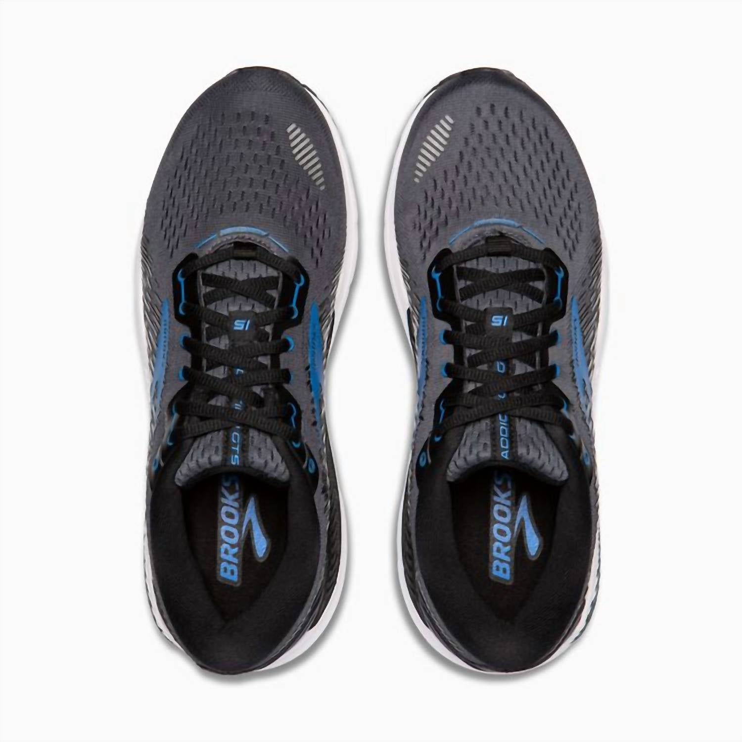 Step up your running game with the Men's Addiction GTS 15 Running Shoes by Brooks. Designed for men seeking added support and comfort, these shoes feature an updated breathable upper that ensures a smooth and stable stride. Material: Durable rubber sole provides traction and longevity for everyday runs and walking activities. Available in India Ink Black Blue, these athletic shoes promise a stylish fit for fitness, workouts, and streetwear occasions.