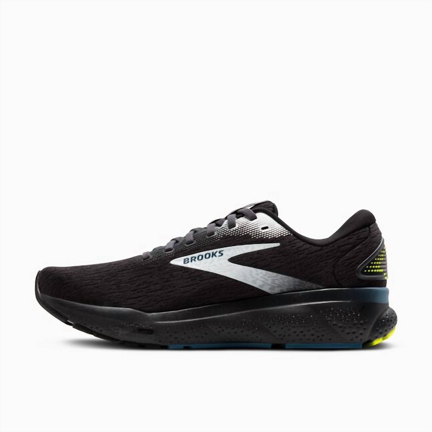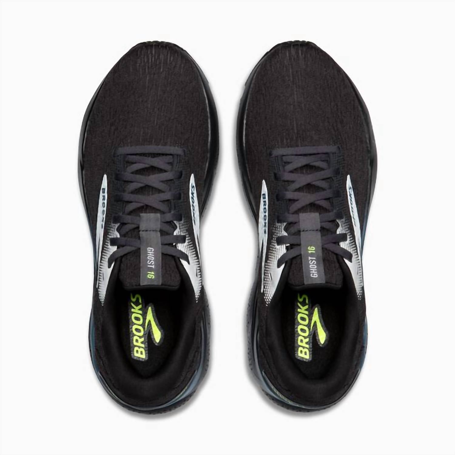 The Men's Ghost 16 Running Shoes by BROOKS in Black/Ebony/Blue offer an ideal blend of performance and comfort for road running and walking. With soft cushioning and an enhanced upper, these sneakers ensure smooth transitions and support every step. They feature a round toe shape, designed specifically for the active adult man. This versatile footwear promises a comfortable fit for your daily runs or casual walks.
