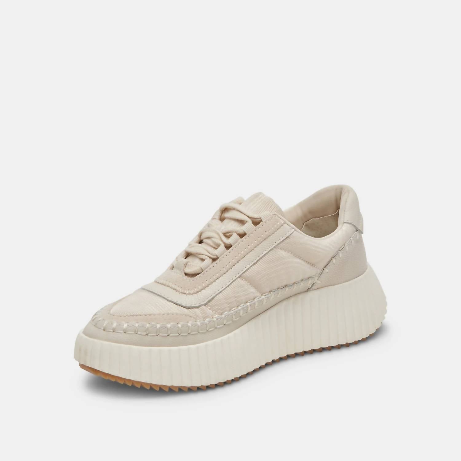 Step up your sneaker game with the Women's Dolen Sneakers by Dolce Vita, a streetwear-inspired shoe in a chic ivory hue. Crafted with a leather and textile upper, these sneakers feature a sporty 1.6" platform wedge heel for a modern look. The round toe and lace-up style ensure a true-to-size fit, while the rubber outsole, textile lining, and synthetic sock provide comfort and durability. Ideal for spring, these sneakers seamlessly blend fashion and function.