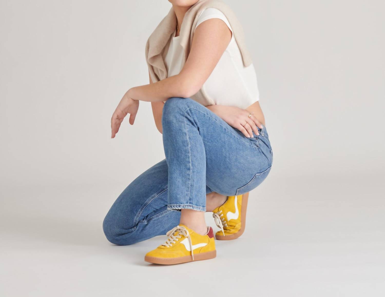 Introducing the Women's Notice Sneakers by Dolce Vita, a fashionable blend of style and sustainability in Mustard Suede. These sneakers boast a suede upper and a recycled textile lining, making them an eco-conscious choice. The rubber outsole ensures excellent traction, while the synthetic sock adds comfort and support for all-day wear. Designed for those who appreciate attention to detail, the Notice Sneakers effortlessly elevate any ensemble.