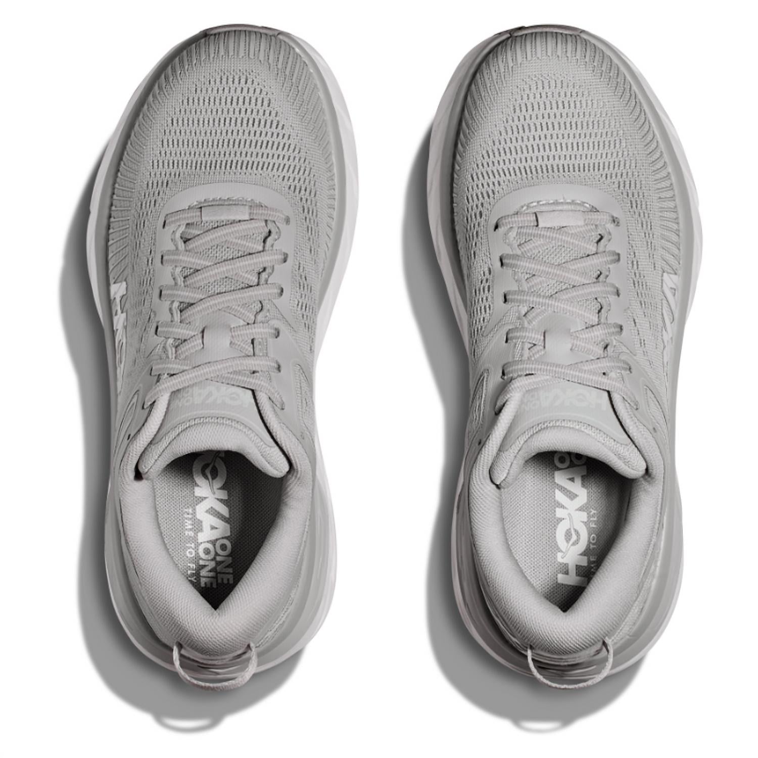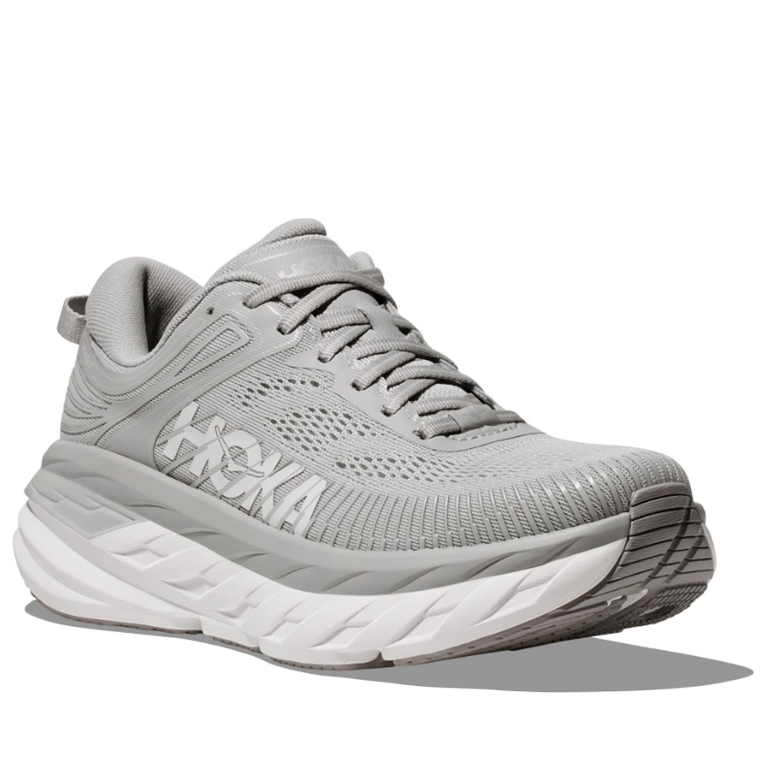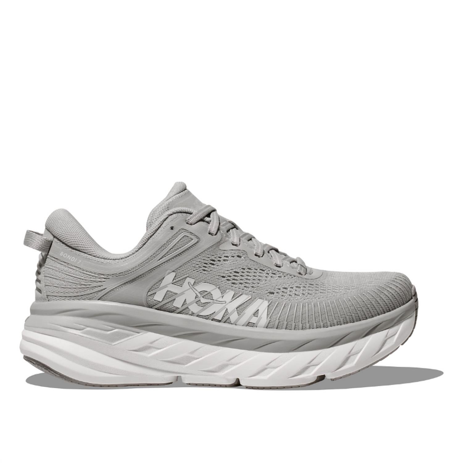 Experience ultimate comfort with the Women's Bondi 7 Road Running Shoes by HOKA, available in a stylish Harbor Mist/white color. Designed with a memory foam collar and open mesh upper, this sneaker offers a plush fit and breathability. It features a full-length EVA midsole and signature Meta-Rocker technology for a balanced ride, complemented by a beveled heel and rubber outsole. Perfect for fitness and athleisure, these shoes offer a vegan-friendly design with a low heel height of 1 1/4"-2".