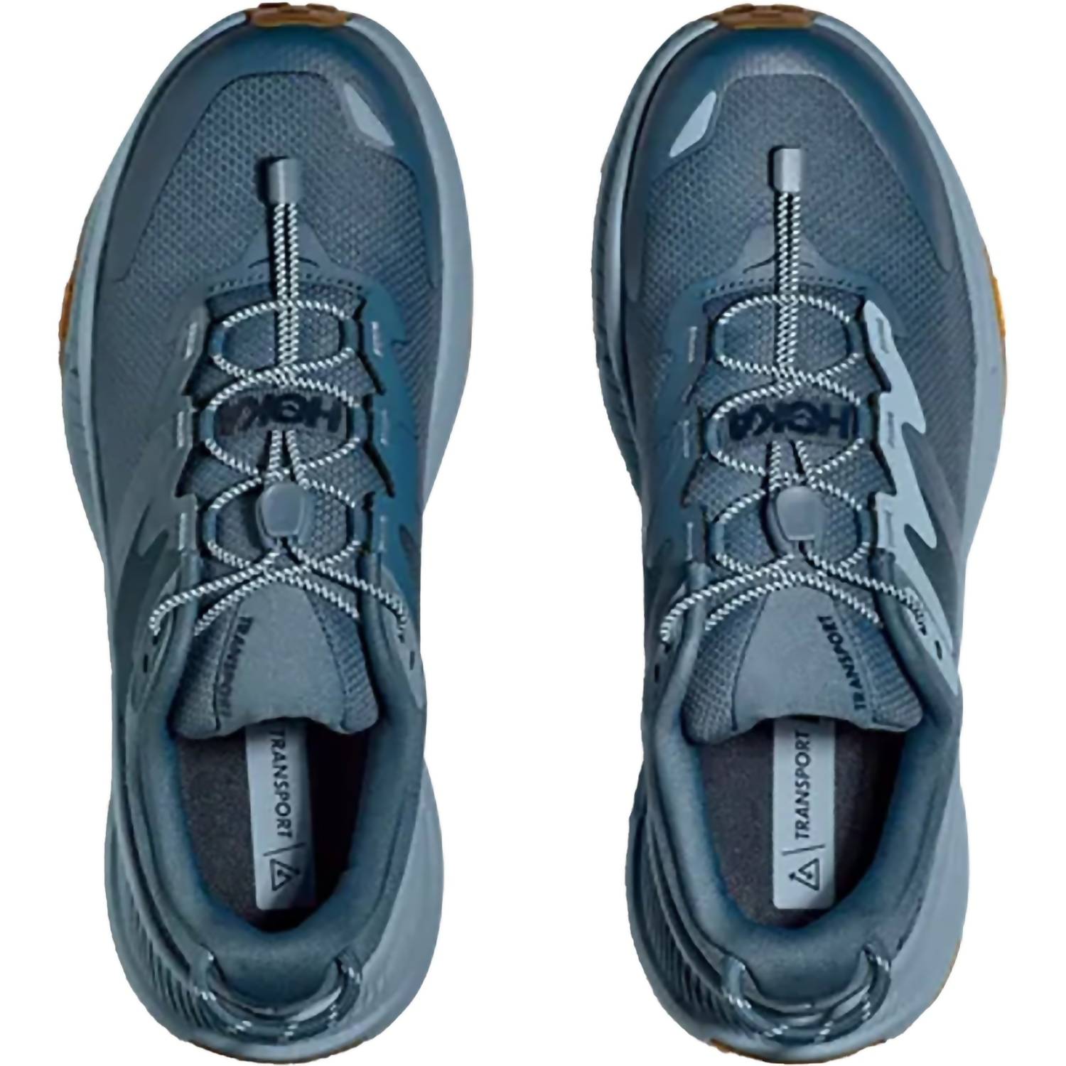 Step into urban adventure with the HOKA Women's Transport Shoes in Real Teal/Dusk, designed for ultimate comfort during city life. The Cordura abrasion-resistant textile upper offers superior protection, while the quick toggle lacing ensures easy wear. Stay visible with 360-degrees of reflectivity and enjoy eco-friendly cushioning from the compression-molded EVA midsole with 30% sugarcane content. Boasting a Vibram Ecostep natural outsole rubber with 90% oil-free ingredients, these shoes are vegan friendly, water-resistant, and crafted from recycled and natural materials. Ideal for fitness and athleisure enthusiasts.