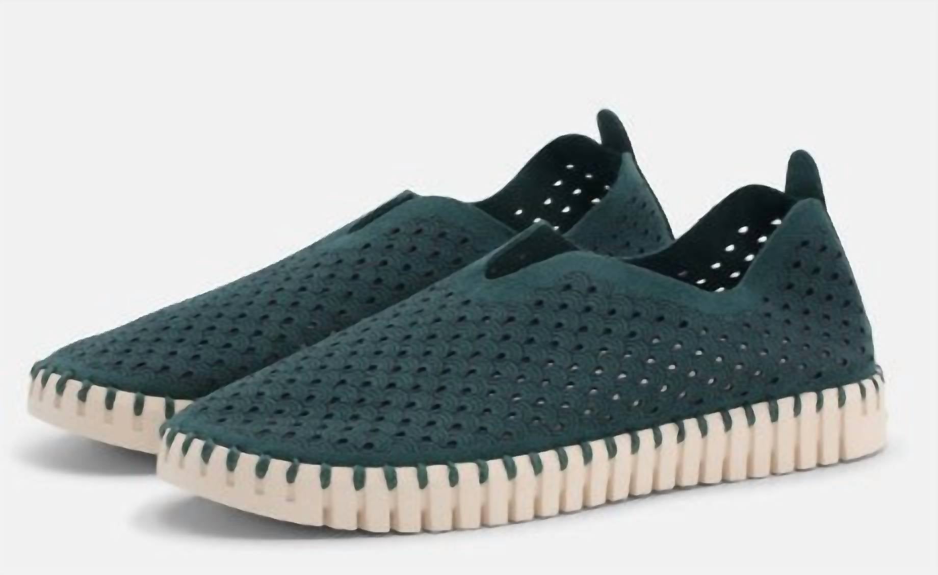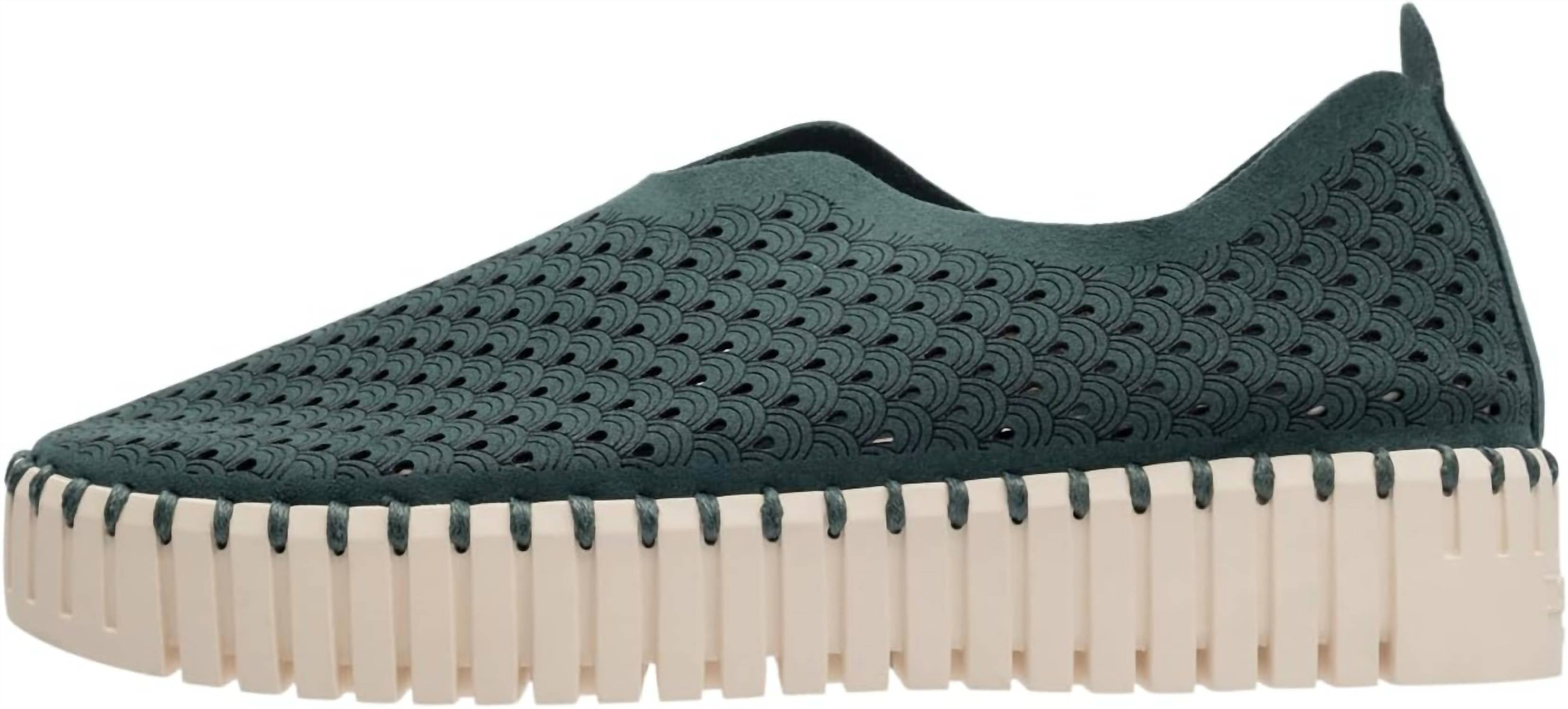 Presenting the Women's Tulip Slip On Platform Sneakers by Ilse Jacobsen, a statement piece in a stylish Beetle shade perfect for spring vacations. Combining a sustainable design with a preppy trend, these sneakers feature a flat heel under 1" and a round toe shape. Crafted with a durable outsole made of 75% natural rubber and 25% recycled rubber, they boast a decorative, laser-cut pattern made from recycled microfiber, ensuring flexibility and comfort. The pig suede insole with padding offers excellent foot support, making them your ideal companion for everyday strolls.