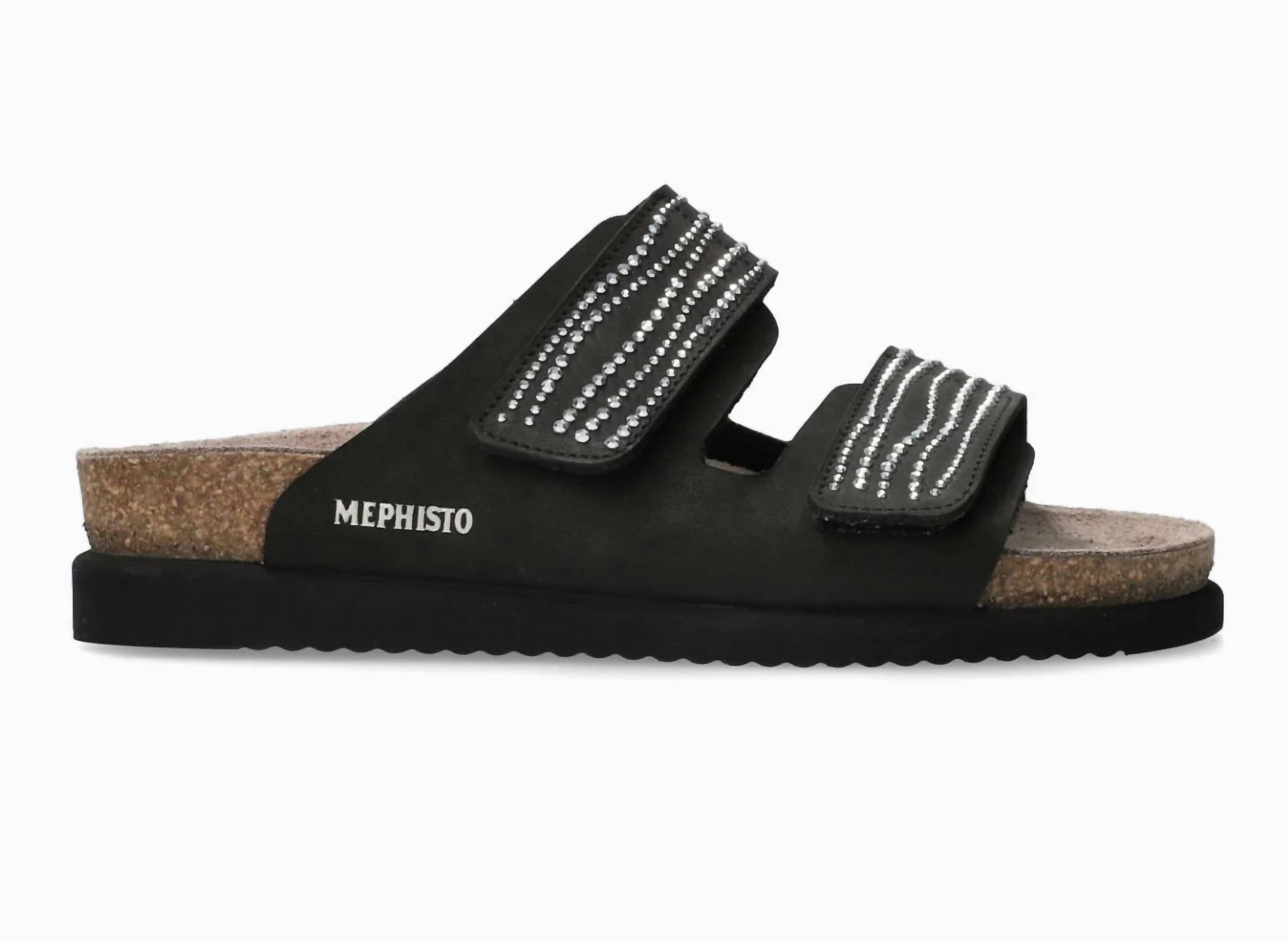This sandal will take you from brunch to dinner and everything in between. Introducing the Women's Halma Spark Sandal by MEPHISTO, crafted in sleek black leather for the perfect summer vacation. Designed specifically for women, this sandal features a firm non-flex outsole with the highest arch support for plantar fasciitis and heel spurs, ensuring comfort on any occasion. The two adjustable velcro straps provide a customized fit, while the open toe design and flat heel height of 0.5 inches add to its casual appeal. Enjoy a shoe that fits true to size, with a non-removable footbed for added convenience.