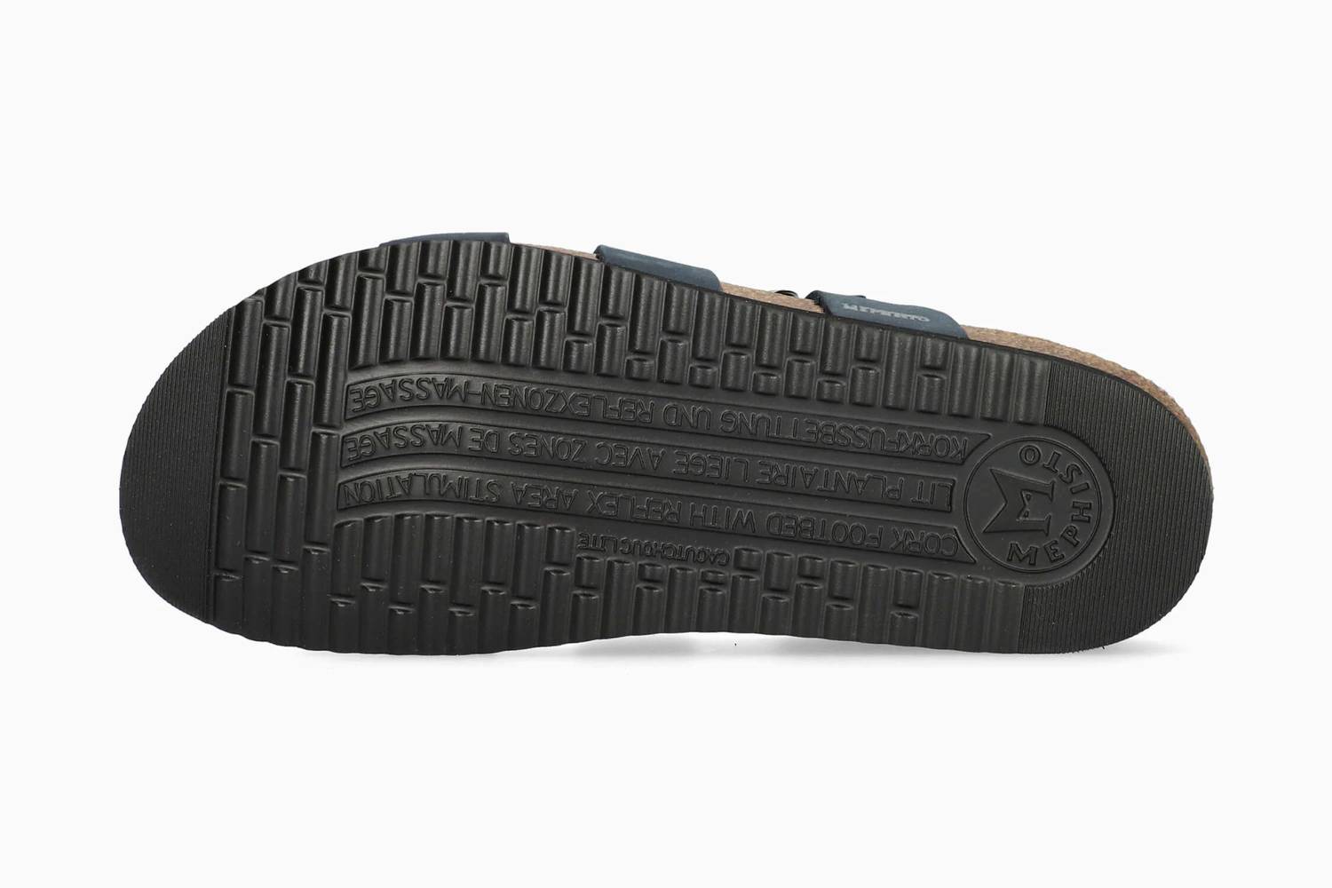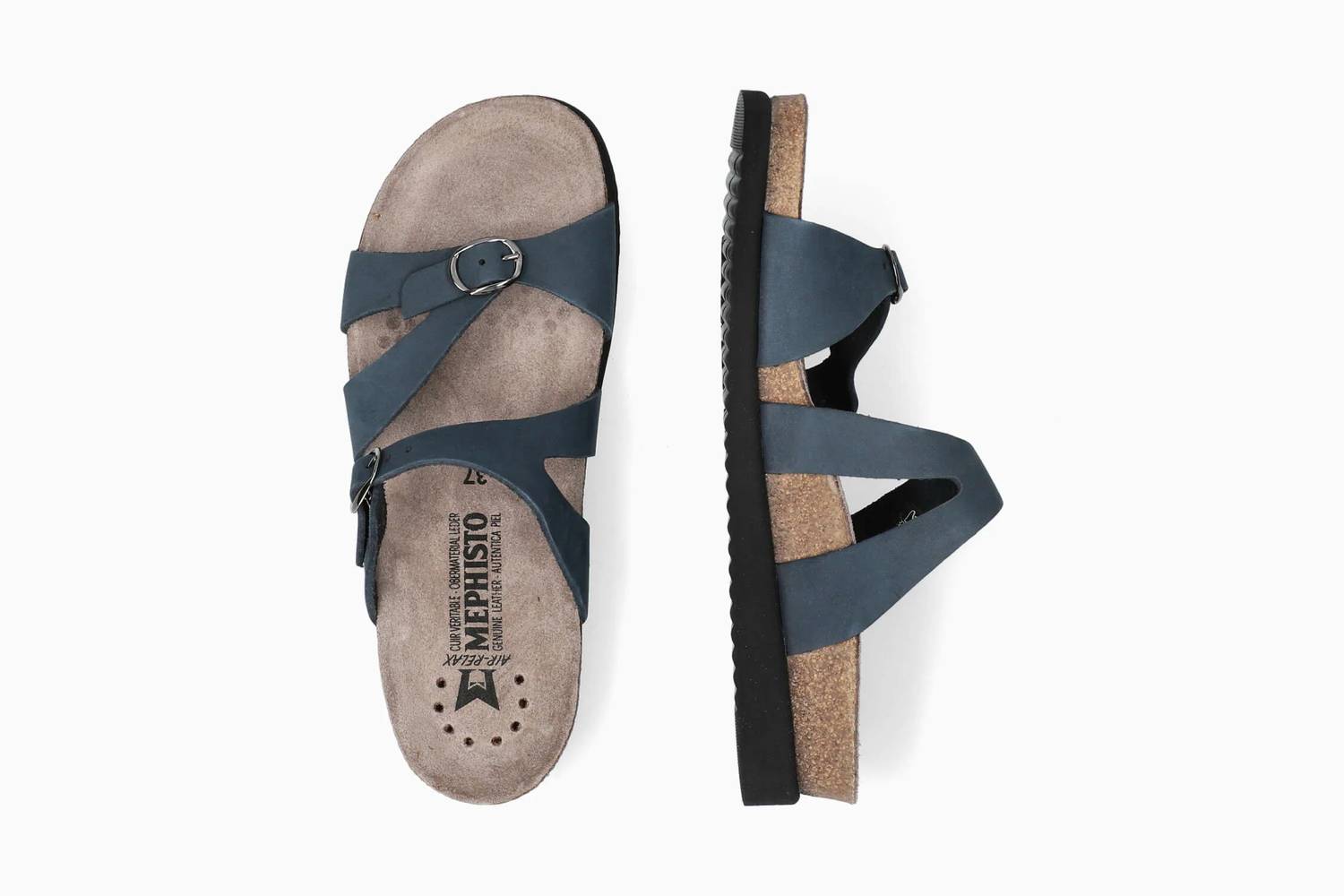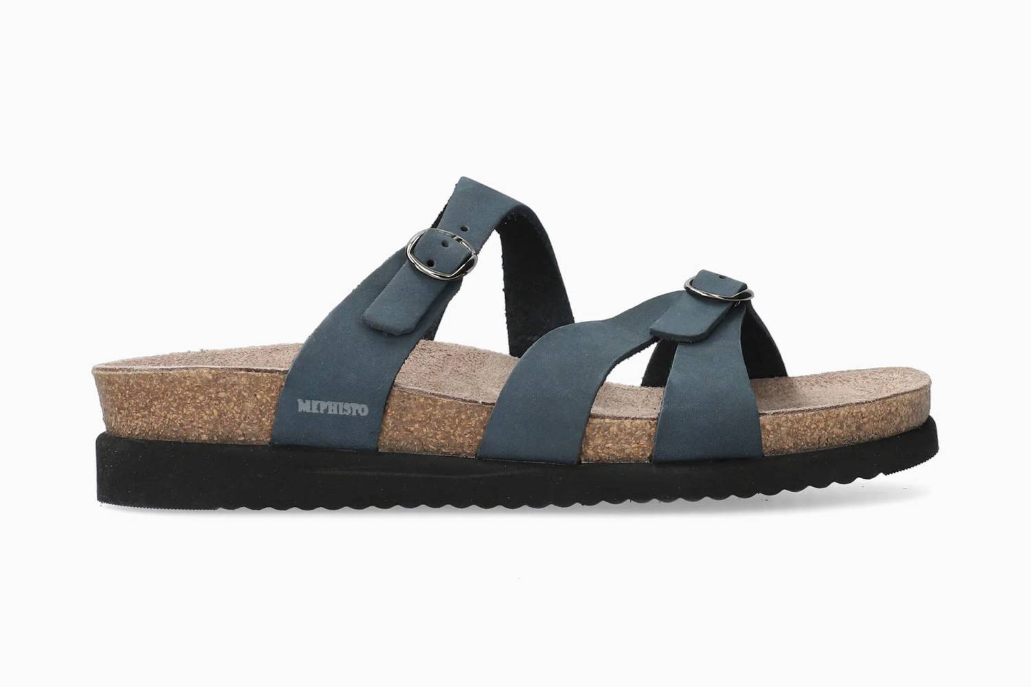 Discover the Women's Hannel Sandal by MEPHISTO, crafted from luxe nubuck leather in a rich navy hue. Designed with adjustable criss-cross straps and buckle closures, this sandal ensures a chic fit for every foot. Its leather-lined cork footbed with exclusive AIR-RELAX technology offers all-day support and comfort, promoting proper positioning to reduce fatigue. The design features a flat heel and open toe, ideal for outdoor versatility in standard width.