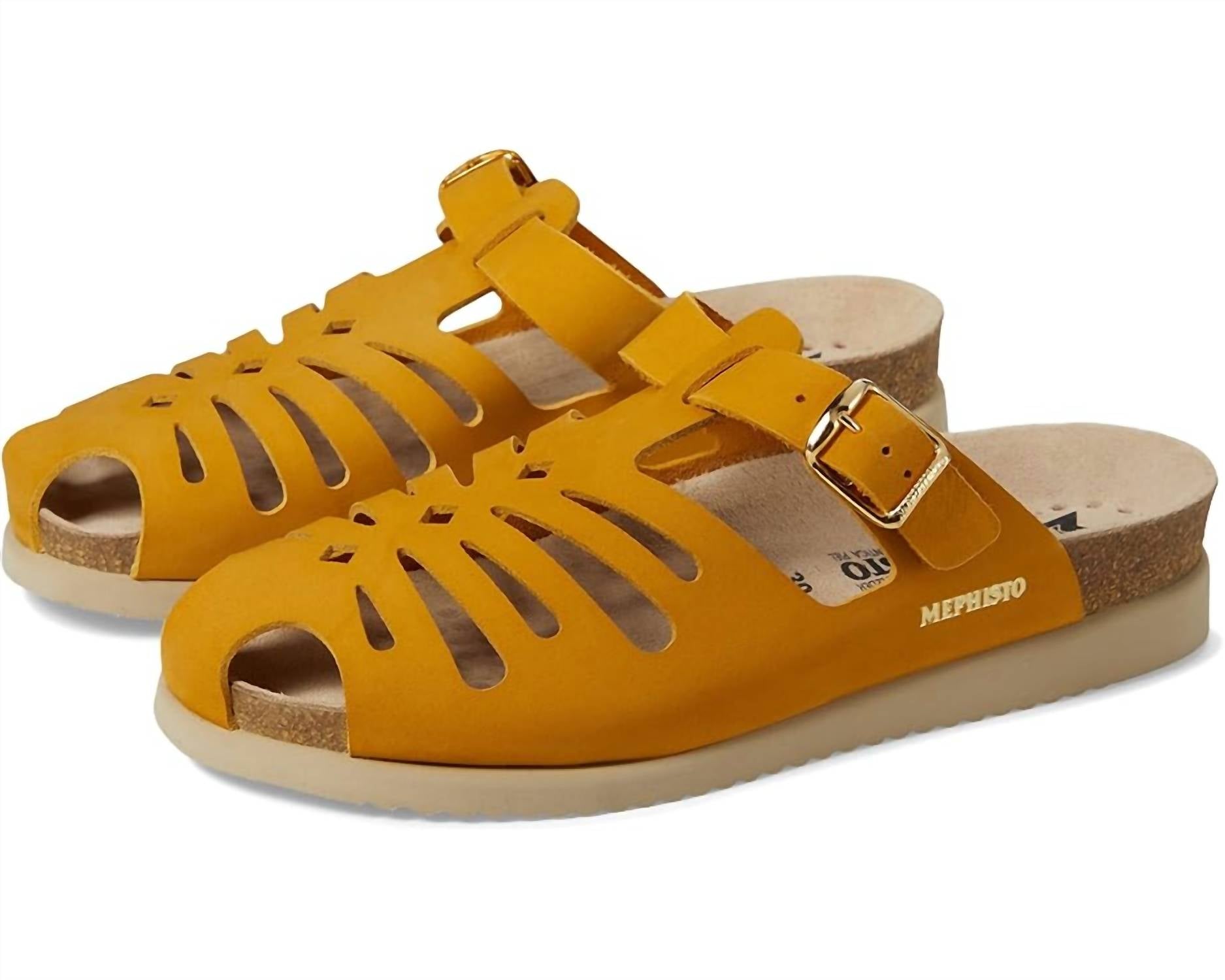 Step into summer style with the Women's Hedina Sandal by MEPHISTO in a striking ochre hue. Crafted from premium leather, this streetwear-inspired sandal features a round toe design and a comfortable wedge heel, ideal for vacation wear. Perfect for adult women who appreciate both fashion and function. Embrace this chic choice for any sunny getaway or casual outing.