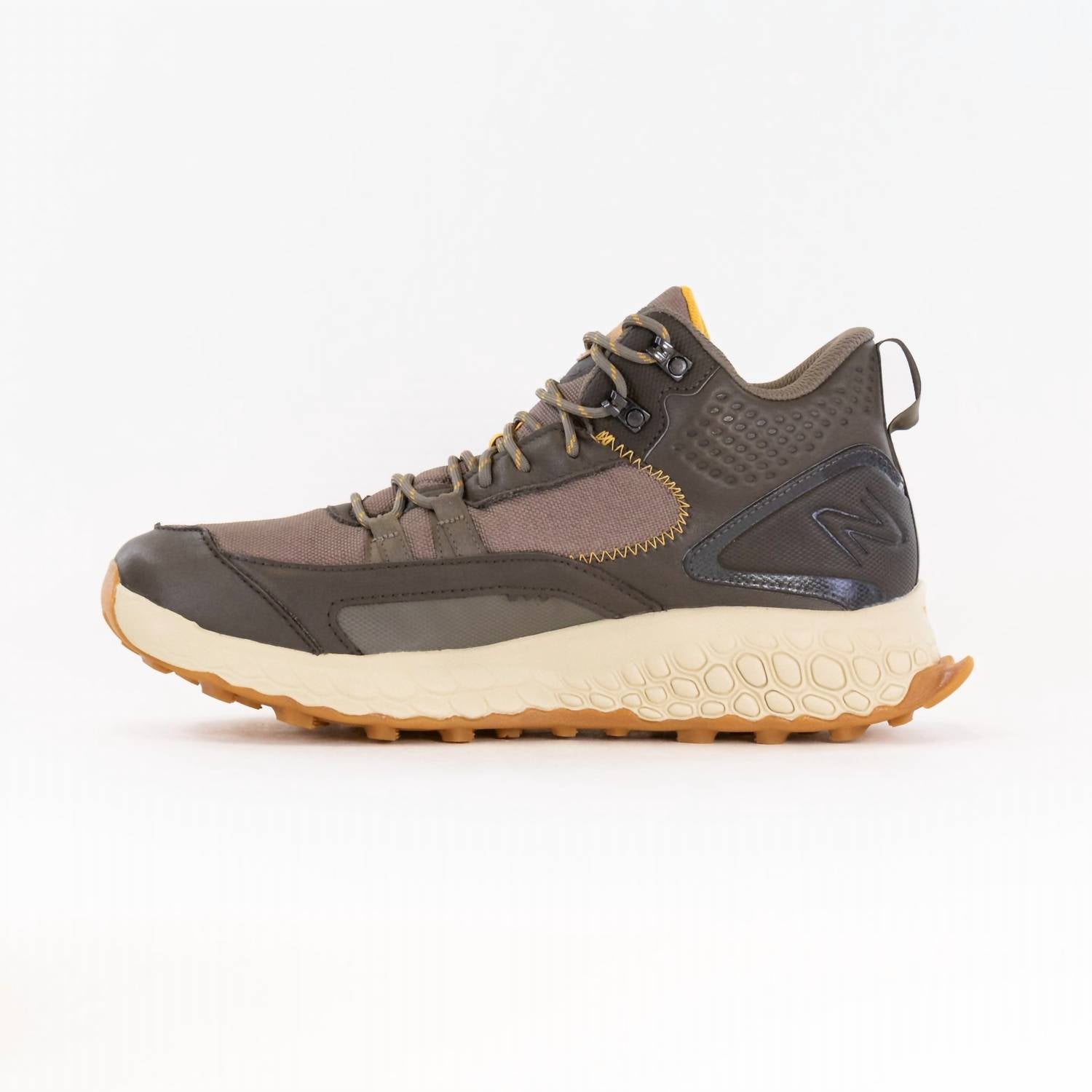 Introducing the Men's Fresh Foam X Hierro Mid Gore Tex by New Balance, a robust sneaker for trailblazers seeking adventure in BROWN GREY. The mid-cut upper crafted from rugged leather features a GORE-TEX® waterproof fabric, offering protection against elements without compromising breathability. A Vibram® Megagrip outsole ensures superior traction, while the Fresh Foam X midsole provides exceptional cushioning for comfort on uneven terrains. With Toe Protect technology, these sneakers safeguard against rocks and trail debris, making them perfect for summer fitness and streetwear adventures. 8 mm drop; variances during development may affect the drop measurement.