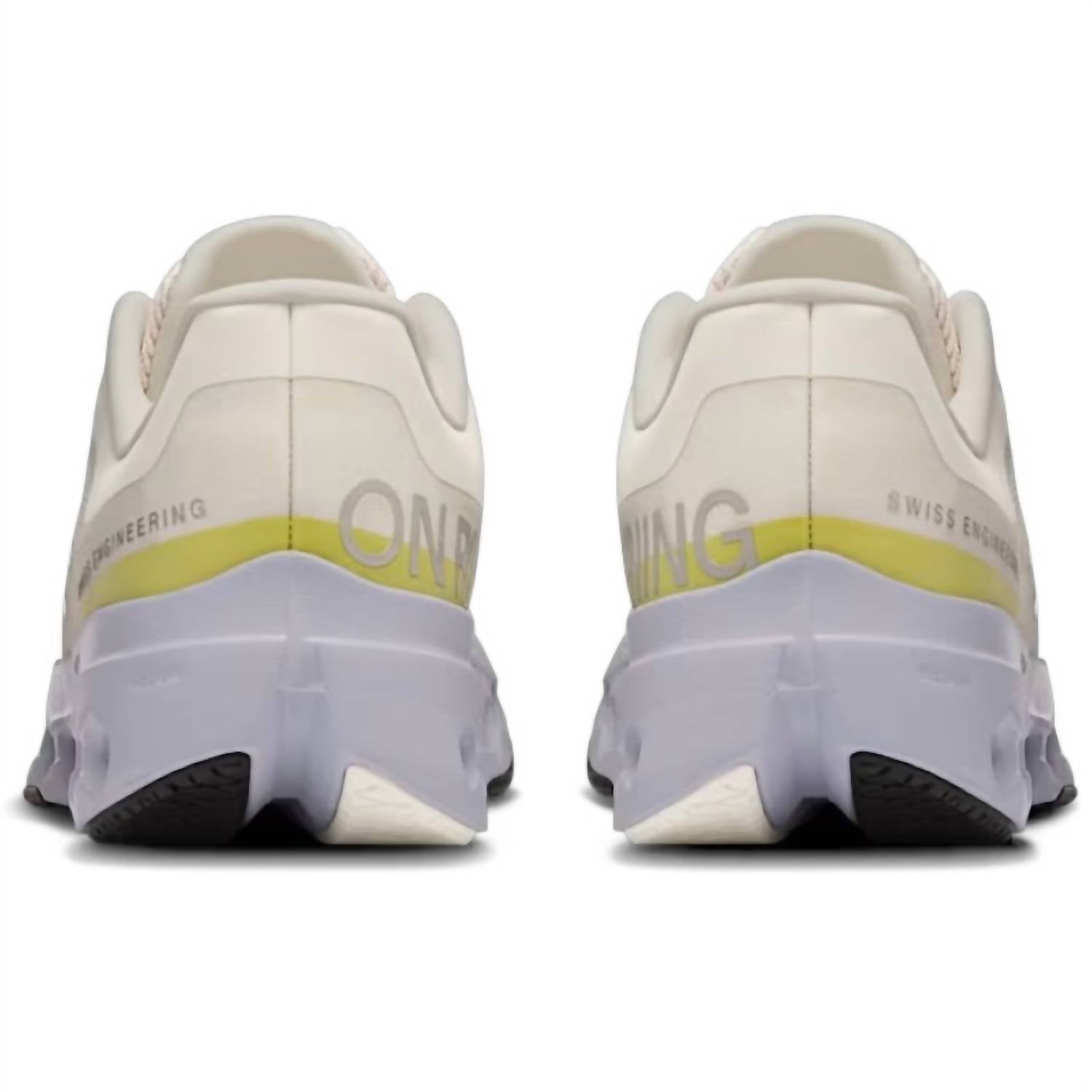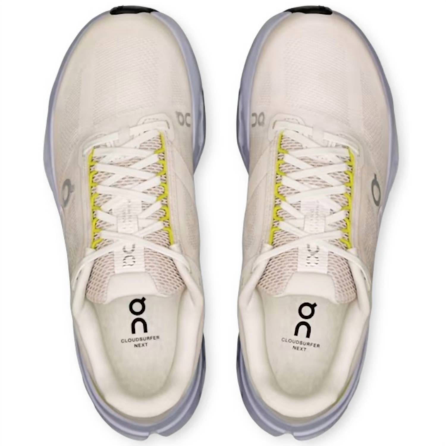 Introducing the Women's On Cloud Surfer Next Shoes by On Running, the perfect fusion of style and performance for your fitness and workout needs. These shoes feature a round toe design with a flat heel height of 1" and under, ideal for your summer athleisure looks. Presented in an elegant ivory/nimbus color, they're tailored for active women with a focus on comfort and style. Perfect for the 4th of July and beyond, these athletic shoes are your go-to choice for casual fitness occasions.