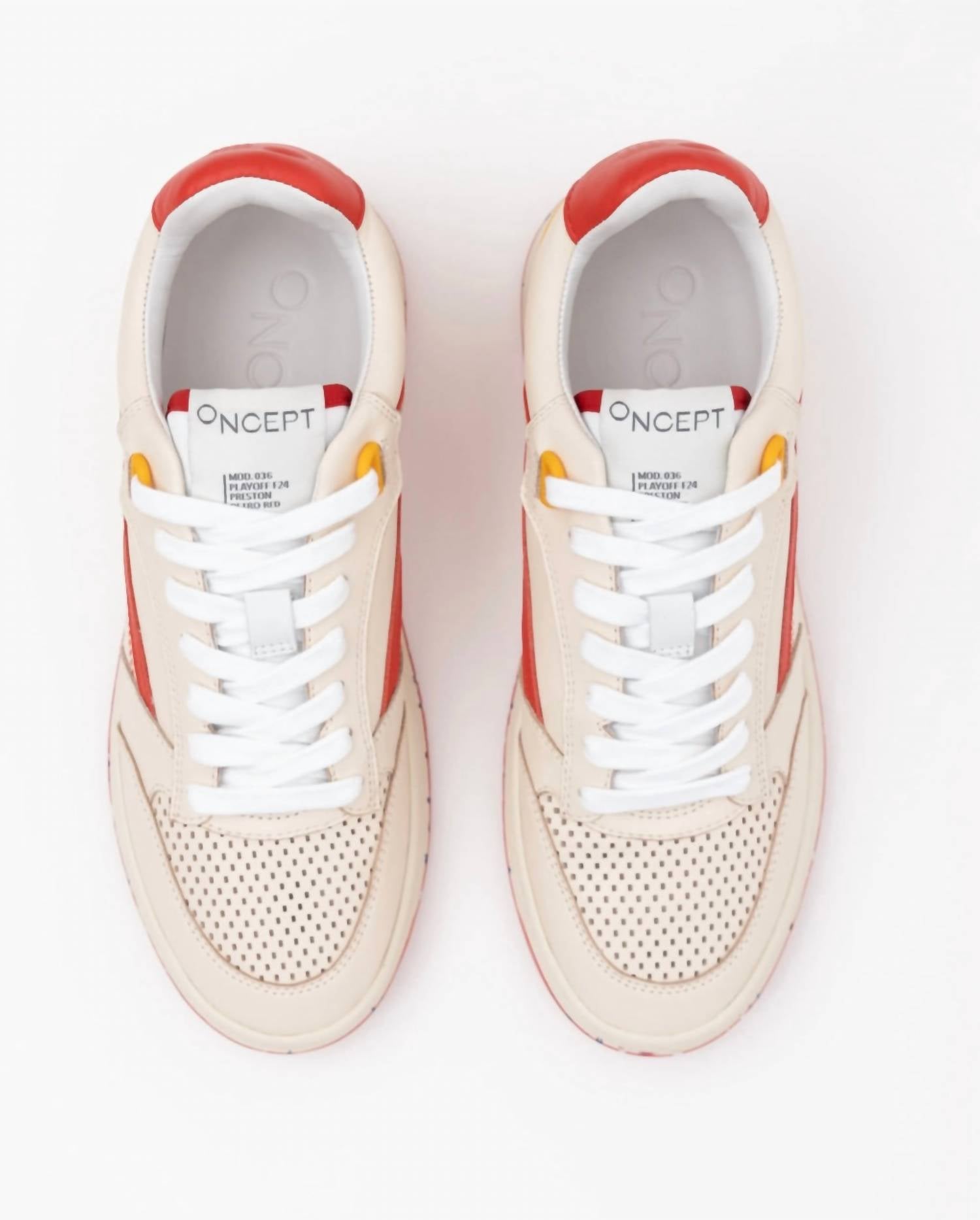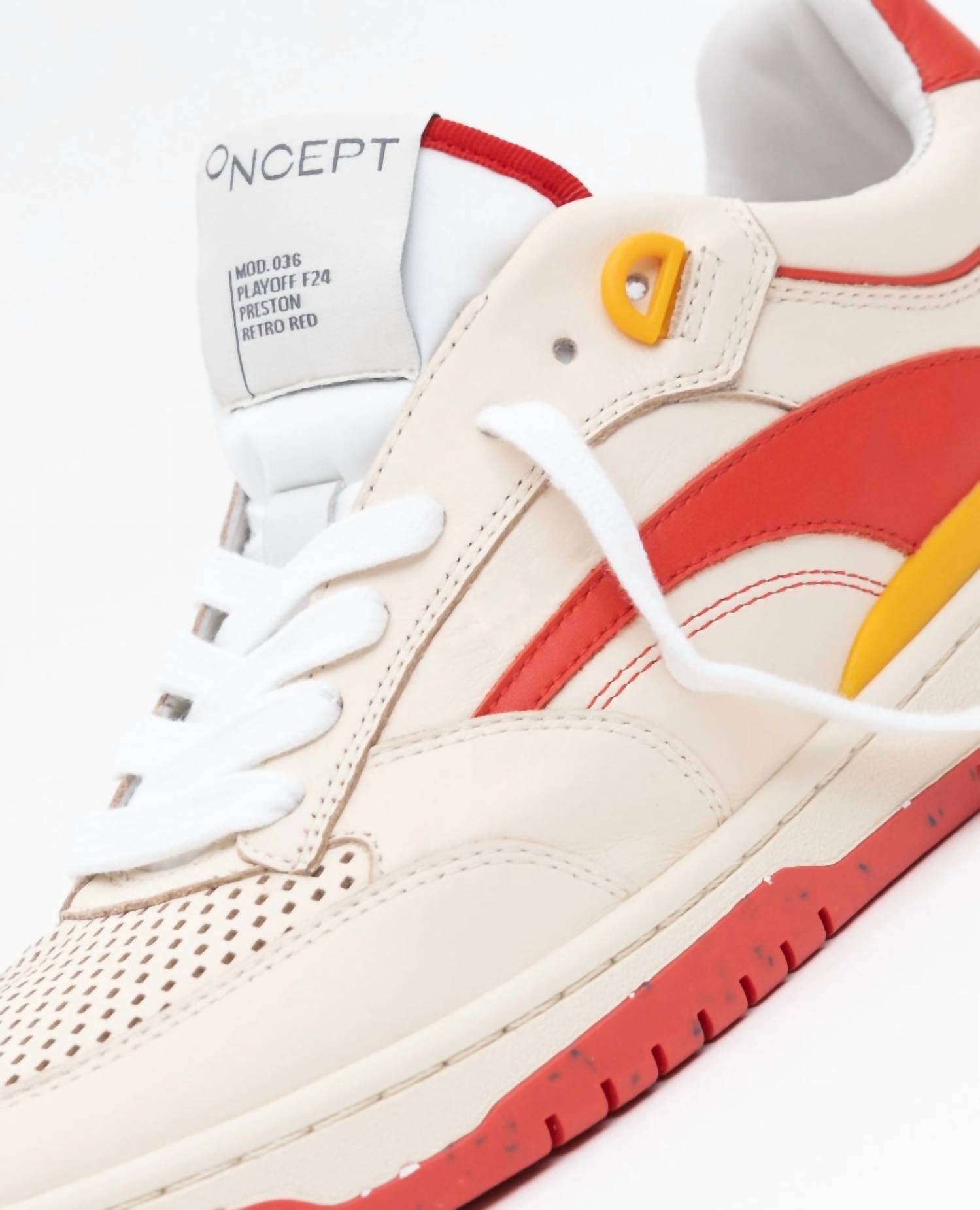 Discover the Women's Preston Sneaker by Oncept, a stylish blend of nostalgic charm and innovative sustainability in Retro Red. These sneakers are crafted with ultra-soft leathers and feature a timeless silhouette with bold, retro colorways for effortless flair. Designed with a round toe and flat heel, they run true to size and boast a refined groove design for extreme flexibility. Molded removable sock footbed ensures added comfort, embodying Oncept's commitment to fashion with purpose.
