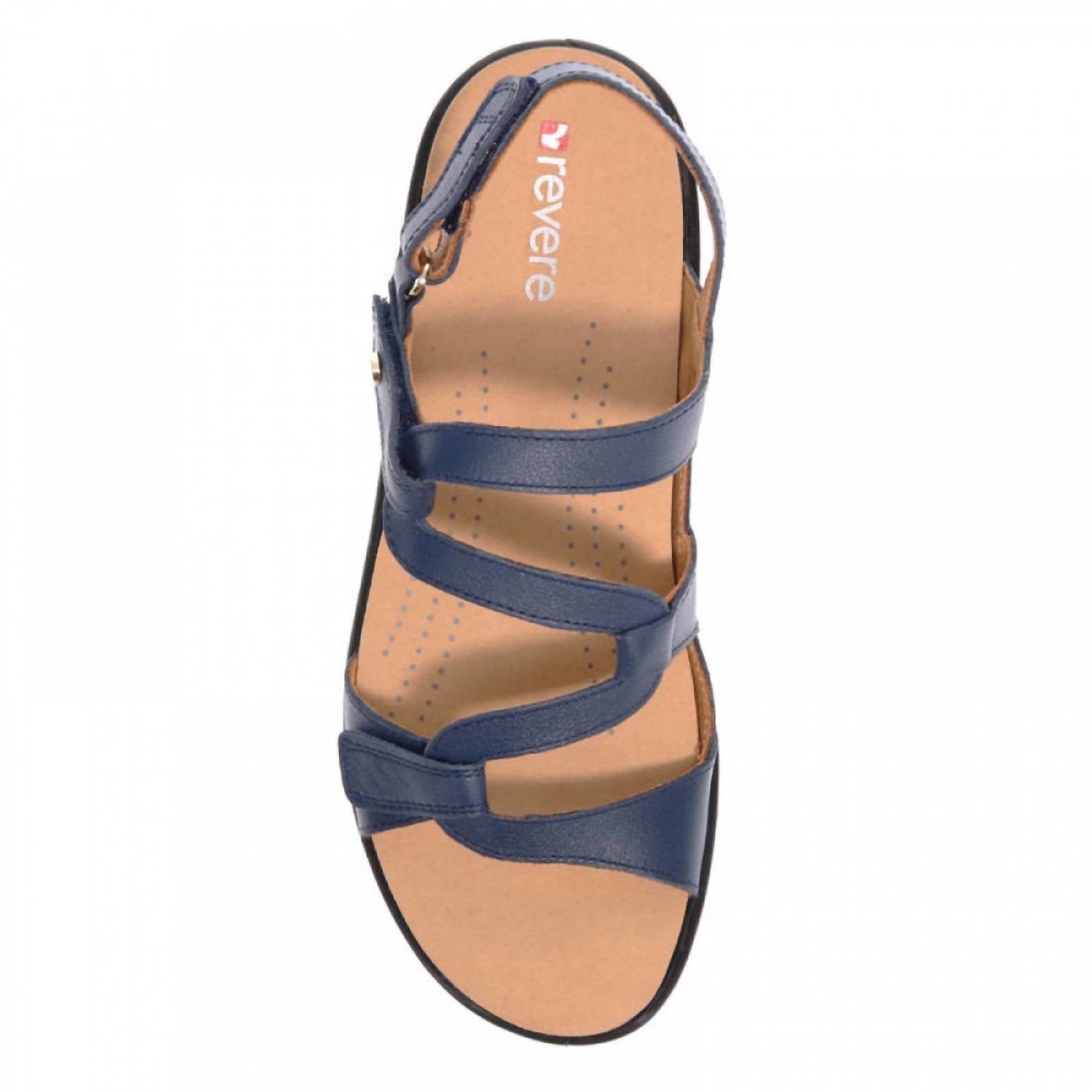 Introducing the Women's Emerald 3 Strap Sandals by Revere, embodying minimalist elegance in Blue French. Crafted from premium soft luxe leather, these sandals feature adjustable straps and a flat heel for all-day comfort. The contoured footbed is removable, allowing for custom orthotics or braces, accommodating both narrow and wide feet. With a true-to-size fit and included strap extensions, they are designed to support and cradle your foot beautifully.