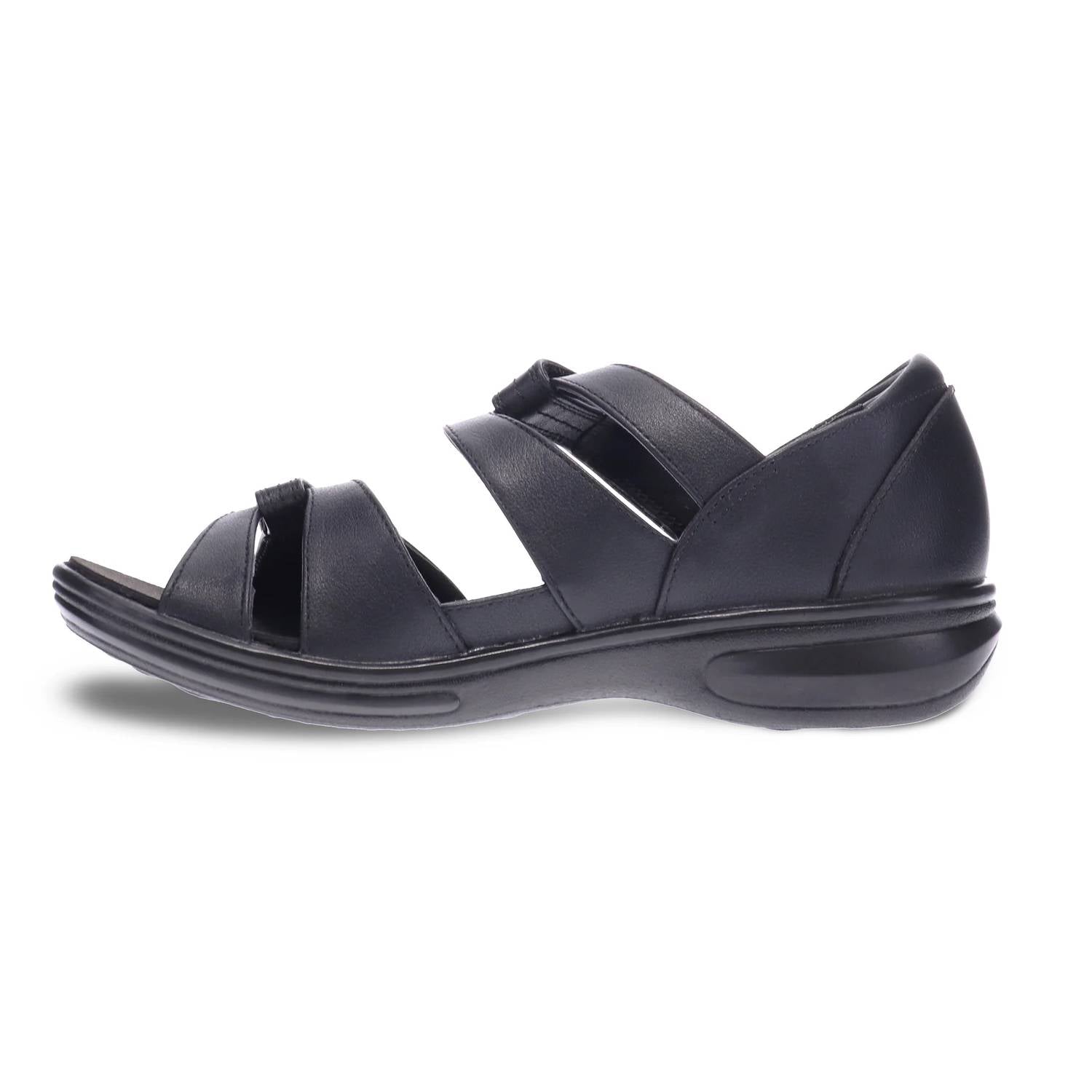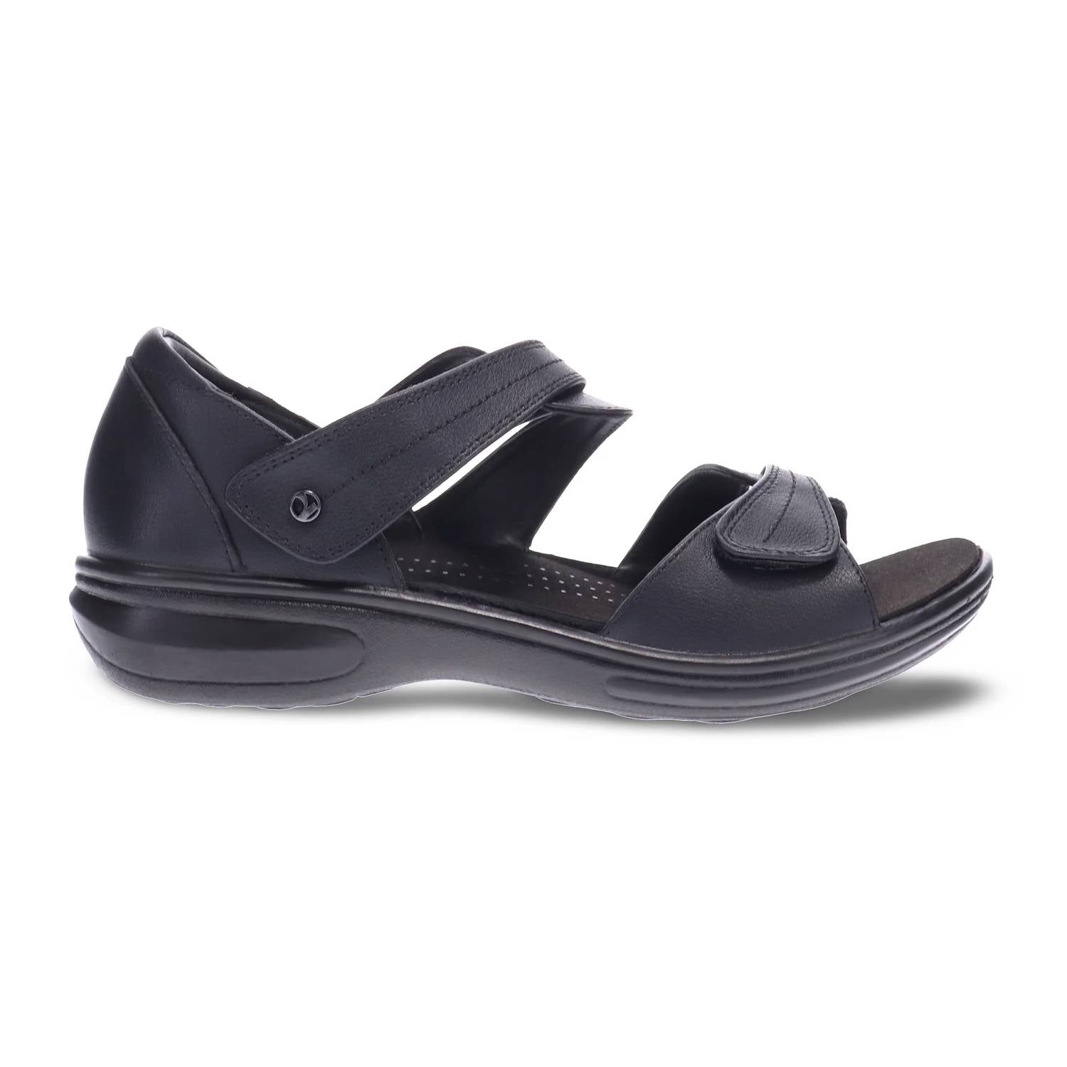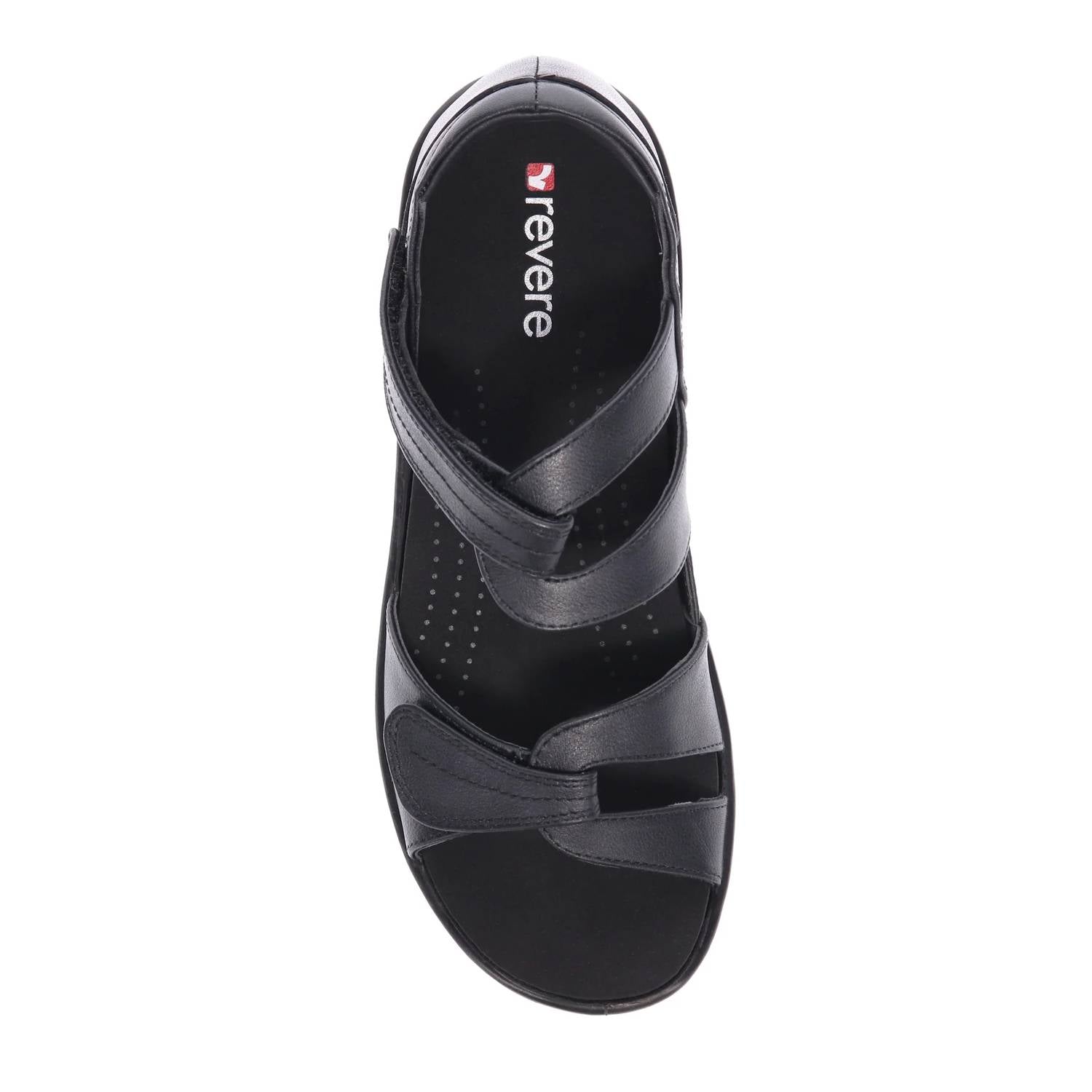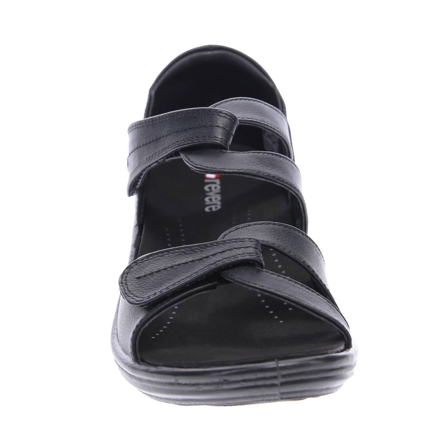 Elevate your summer evening events with the Women's Geneva Sandal by Revere, crafted in premium black leather with a delicate laser cut design that exudes sophistication. This sandal features an open toe, ensuring comfort along with an elegant forefoot and rear foot adjustability for personalized fit. Benefit from the removable comfort footbed with built-in arch support, perfect for accommodating custom orthotics and braces as needed. Designed with slip resistance and maximum adjustability, its care involves simply wiping with a damp cloth and air drying under indirect sunlight.