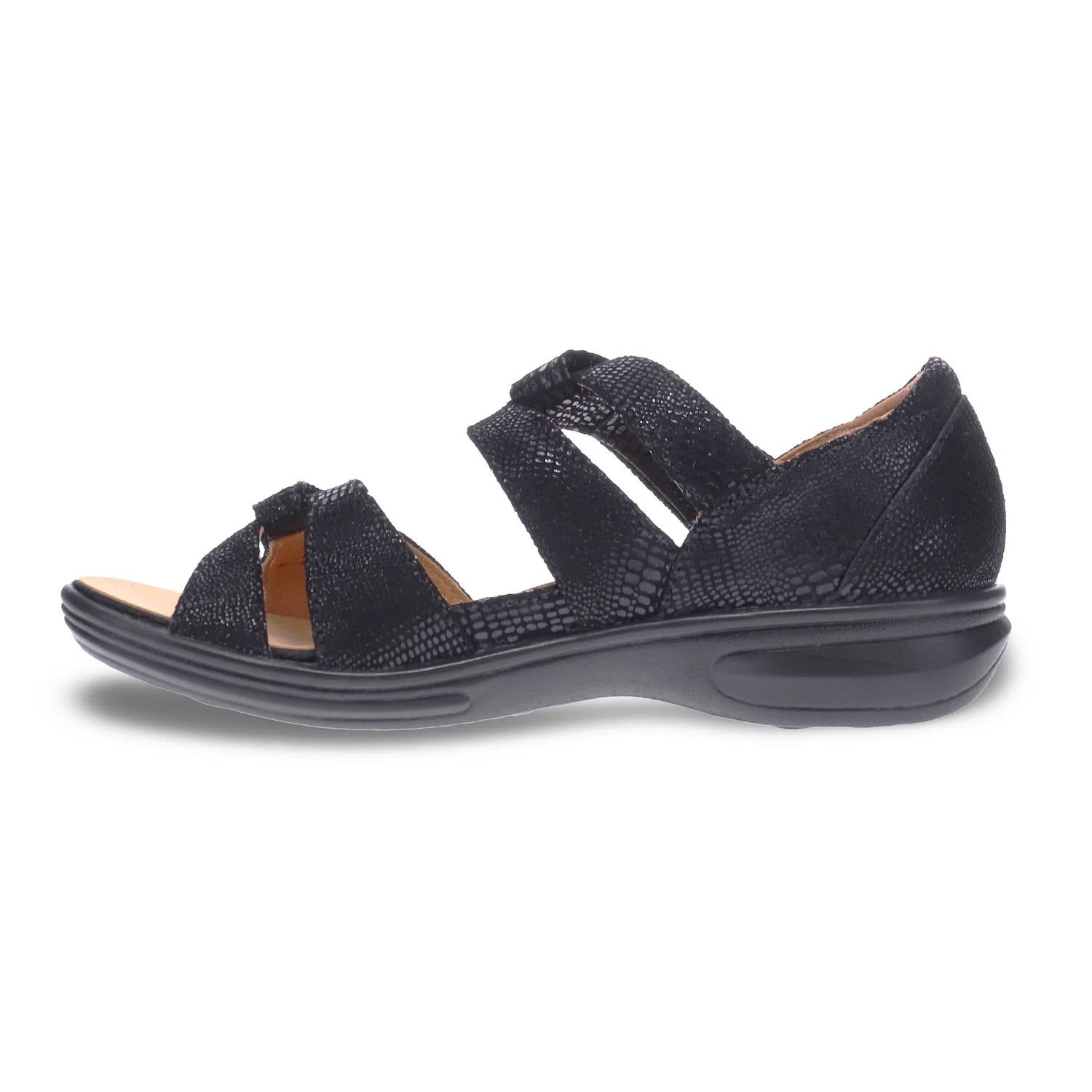 Discover the perfect blend of style and comfort with the Women's Geneva Sandal by Revere, crafted in elegant black lizard leather. This sandal features a customizable fit with both forefoot and rear foot adjustability, ensuring maximum comfort. It includes a removable comfort footbed with built-in arch support, allowing for the addition of custom orthotics if needed. Care is simple: just wipe with a damp cloth and air dry under indirect sunlight. Ideal for summer wear, these sandals offer a slip-resistant outsole and a chic open toe design.