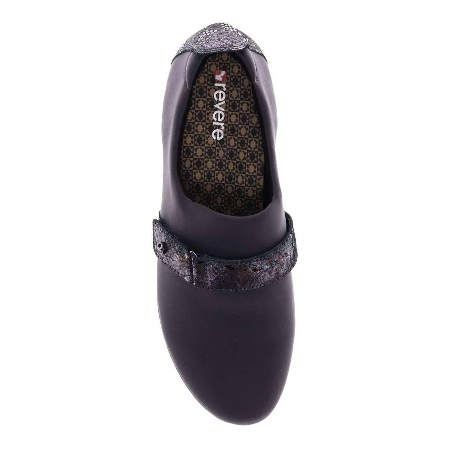 Introducing the Women's Genoa Slip-on Shoes by Revere, a stylish and comfortable choice for those in need of extra foot support. Engineered with stretch textile uppers and a round toe shape, these Graphite/Black Python loafers offer a sophisticated look with an adjustable animal print strap. The removable comfort contoured footbed promotes proper foot alignment, while the Forefoot Cushion Zone and included 3mm filler and strap extenders ensure a customized fit. Perfect for any occasion, these loafers boast a 1.5-inch heel height for added elegance.