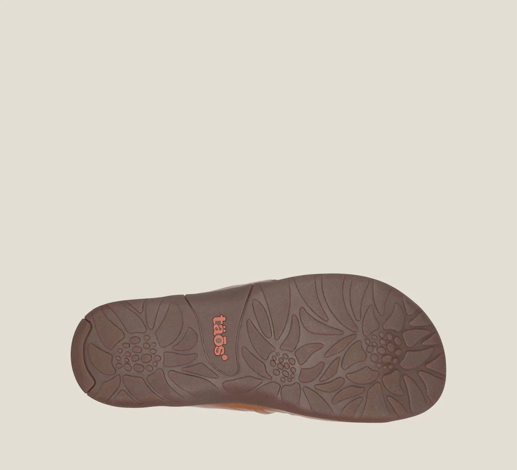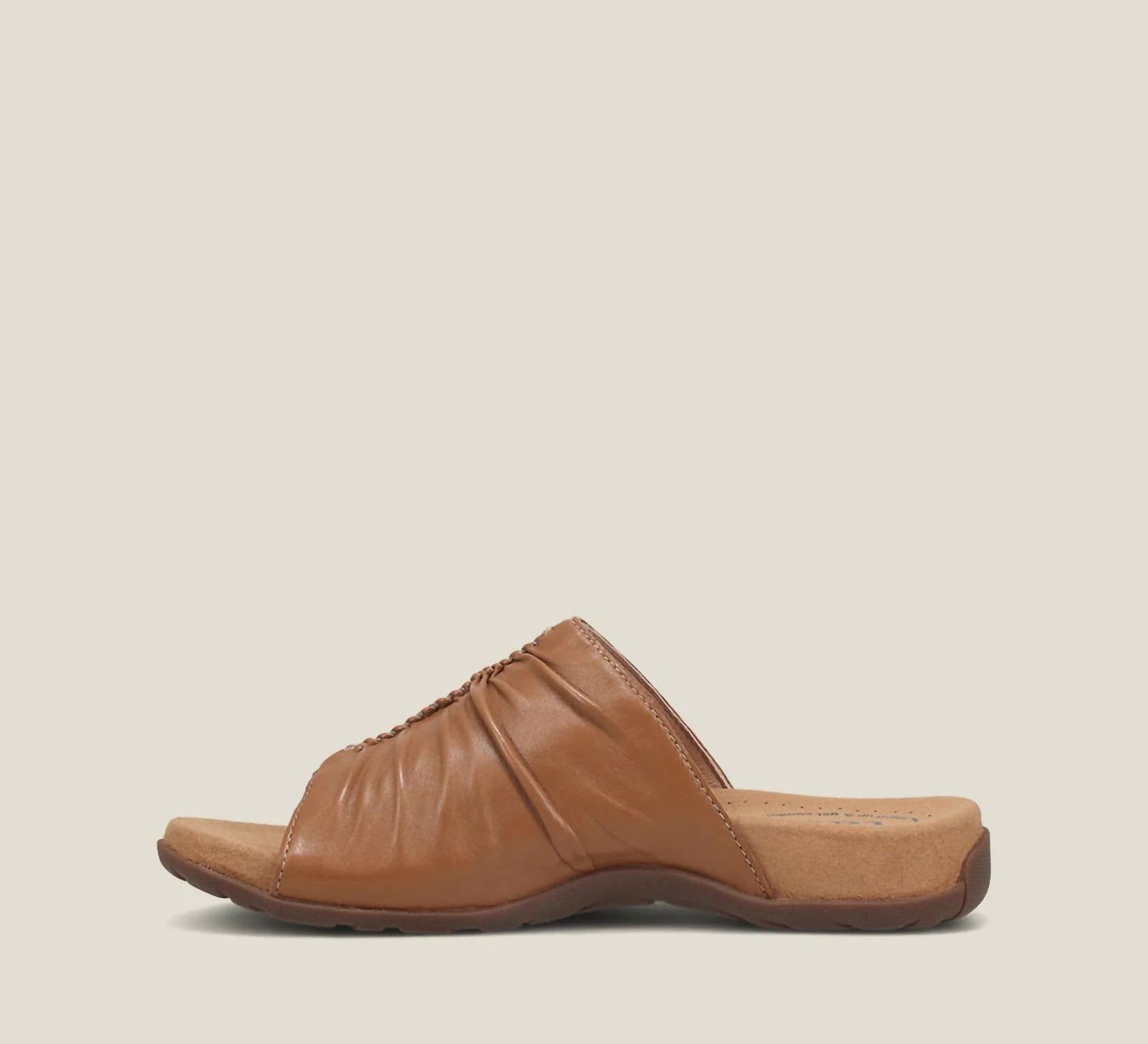 Indulge in the Taos Women's Gift 2 Sandal, the perfect blend of style and comfort with its sumptuous tan leather and hand-stitched scrunch pleating. Featuring an open toe design and a flat heel, standing at a gentle 0.75 inches, it's ideal for boho chic dinner parties during summer nights. The premium Taos Soft Support™ footbed is enhanced with arch and metatarsal support, Cool Recovery Foam®, and antimicrobial shield, ensuring all-day comfort. Care for your sandals by buffing with a leather cleaner or polish and wiping with a dry cloth, with each shoe weighing a light 7.2 oz.
