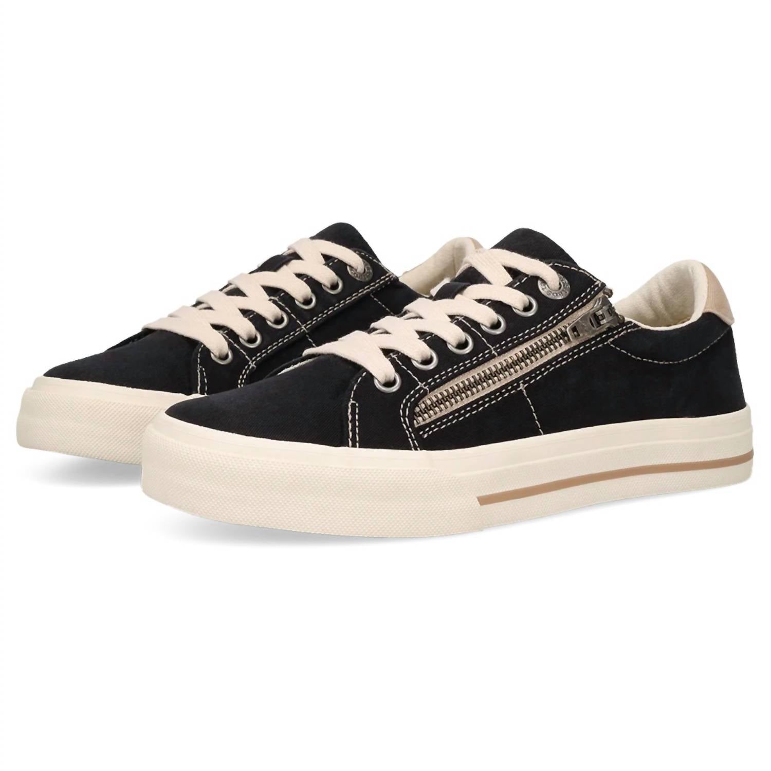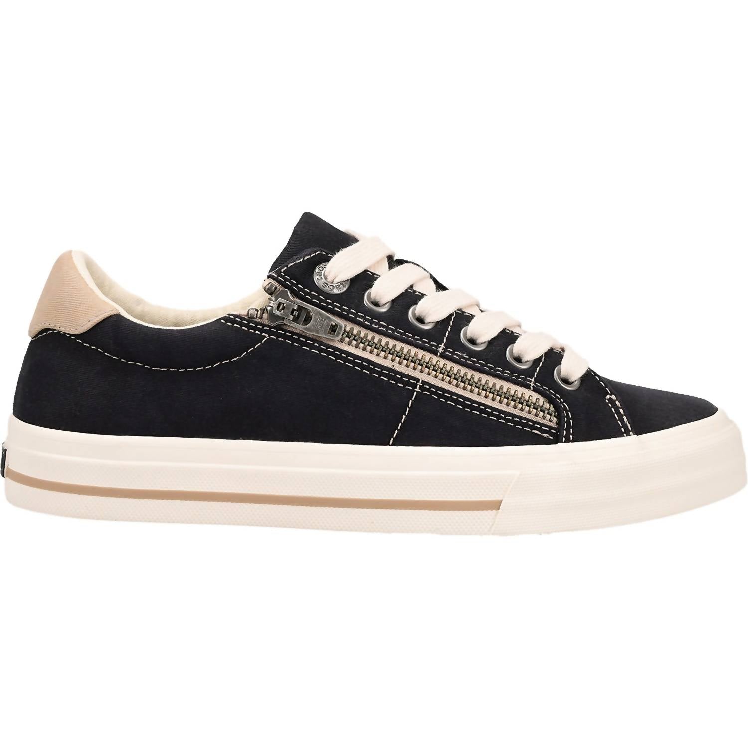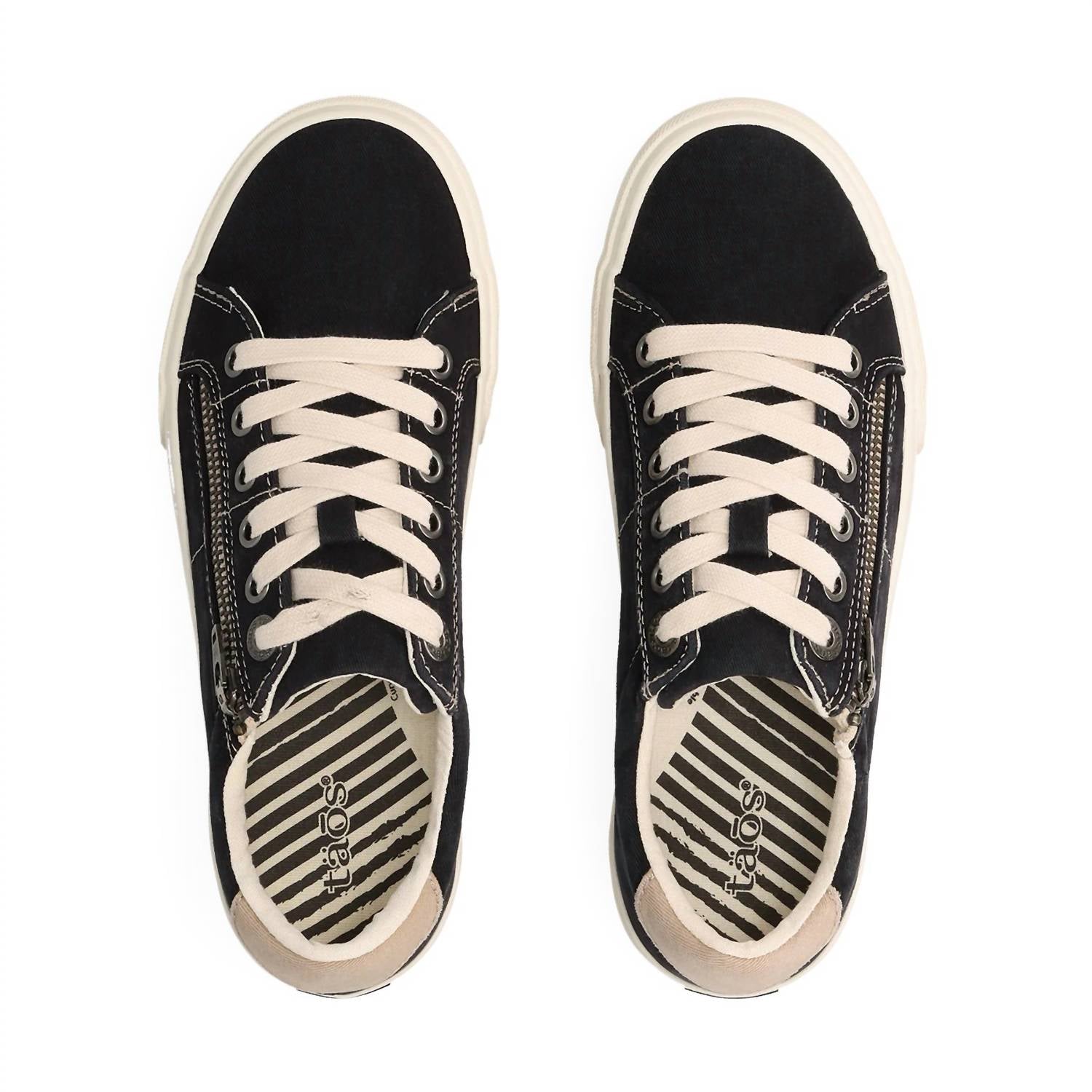 Step into comfort and style with the Taos Women's Z Soul Canvas Sneakers in Black/Tan Distressed. Crafted from durable canvas, these sneakers feature a practical side zipper for easy access and adjustable laces for a perfect fit. The removable Curves and Pods footbed provides exceptional arch and metatarsal support, ensuring all-day comfort whether you're traveling or celebrating New Year's Eve. Ideal for medium-width feet, these flat (1" & under) sneakers echo a 90s fashion vibe and are designed to keep you stylish and comfortable throughout spring.
