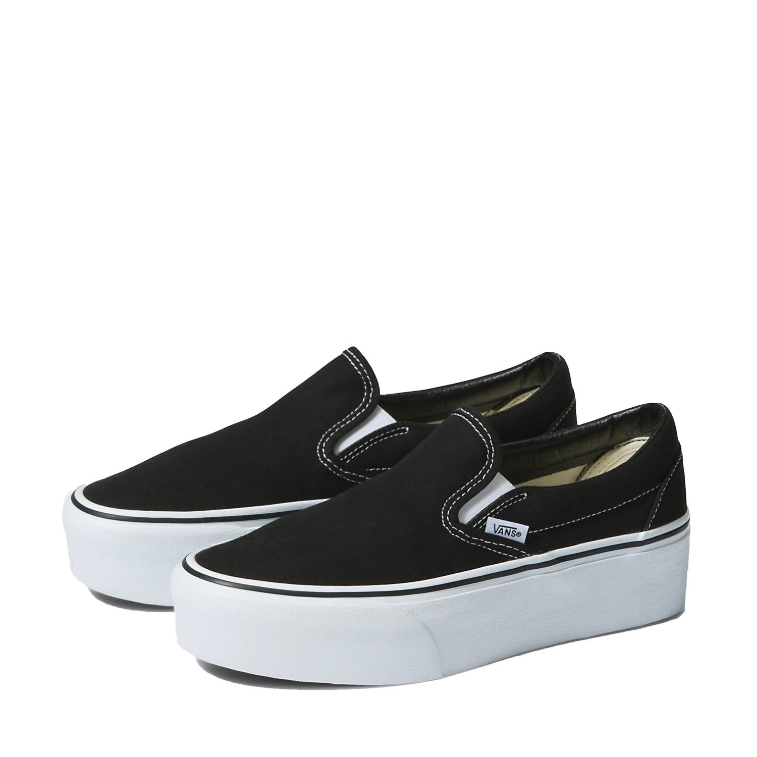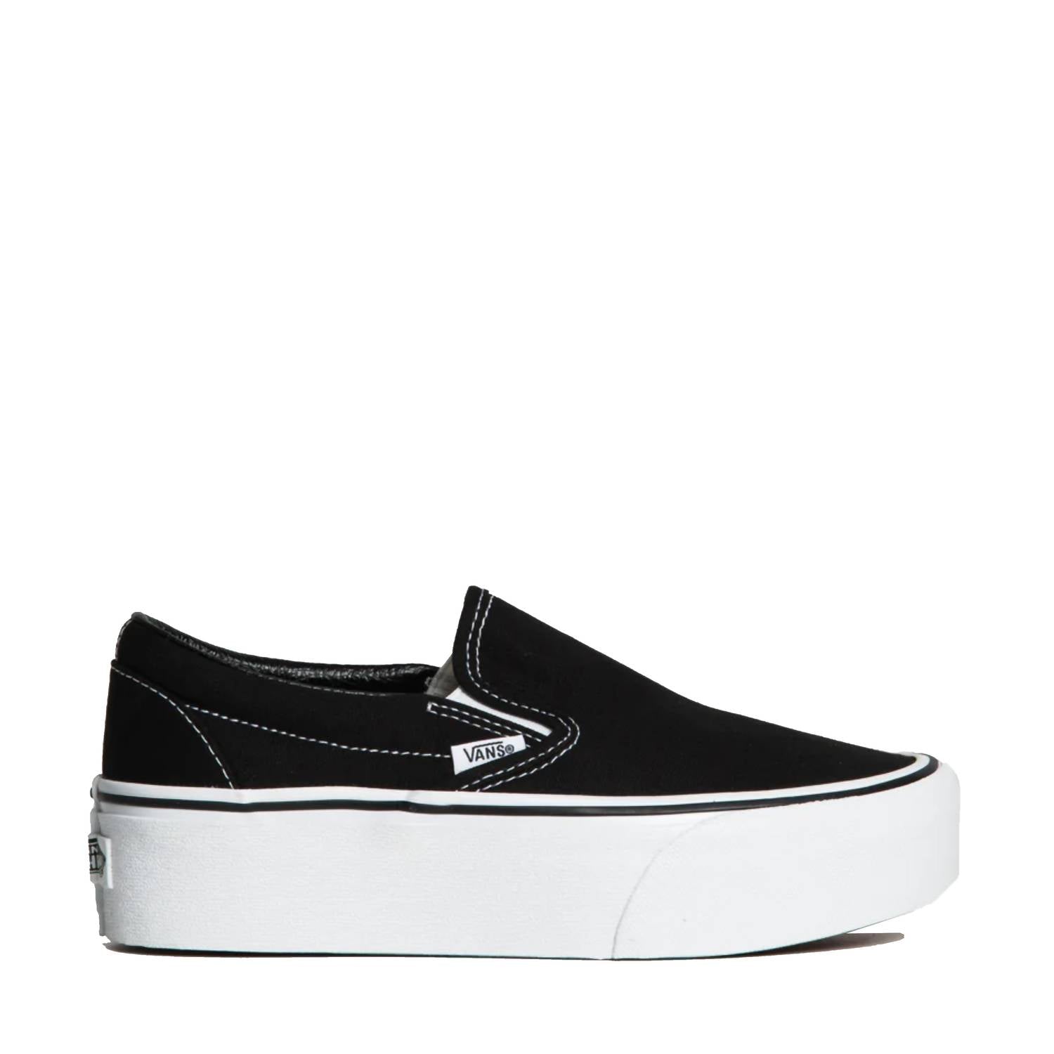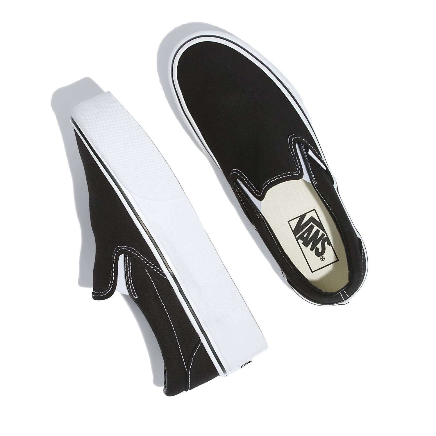 The perfect variation on one of our favorite trends this season. Step into timeless style with Vans Women's Classic Slip-on Stackform Shoes, a staple in Canvas Black/True White. These iconic slip-ons feature a canvas upper, 34 mm/1.33" platform height, and a padded collar for comfort. Elastic side panels ensure easy slip-on and off, complemented by a rubber sidewall with classic foxing stripe. Built with a vulcanized design, these shoes boast the signature waffle outsole pattern, providing reliable grip since '66.