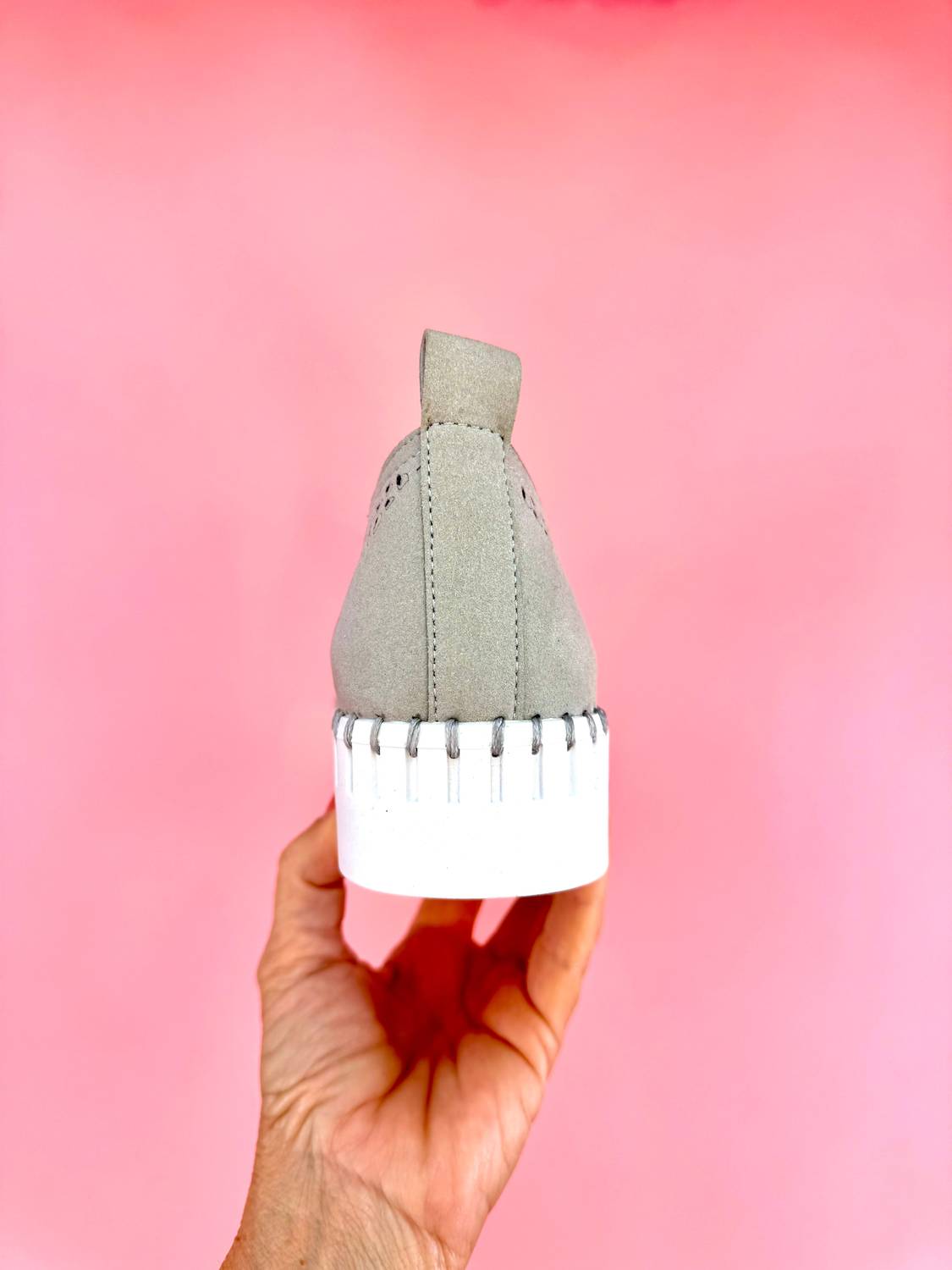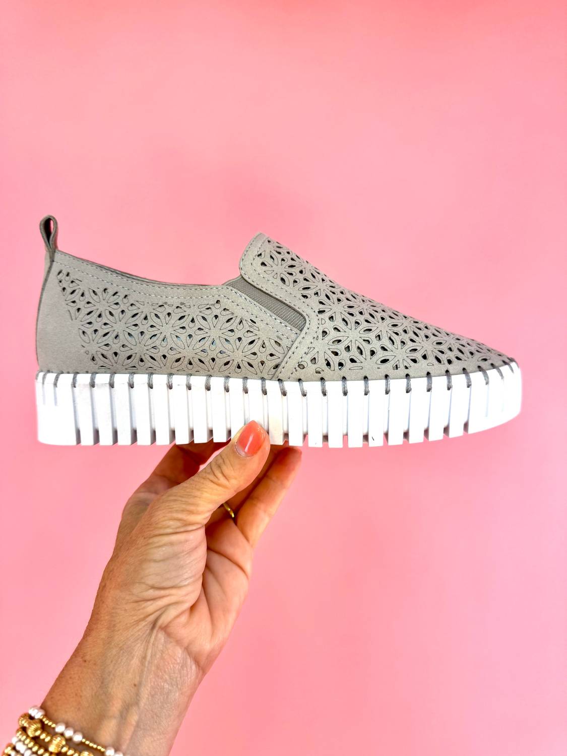 Step into style with the Women's Nicole Perforated Edge Slip On Sneakers by Very G in a chic light grey. These sandals feature a convenient slip-on style, adorned with laser cut details for a playful edge. The shoes boast a flexible sole with a cushion footbed and a white grip bottom for all-day comfort and secure footing. Perfect for travel or summer streetwear, these sneakers are your ideal companion for a fashionable and comfortable journey.