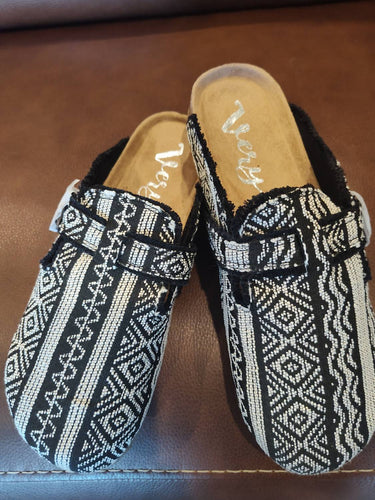 This is a pair of Very G slip-on shoes with a black and white patterned fabric upper.