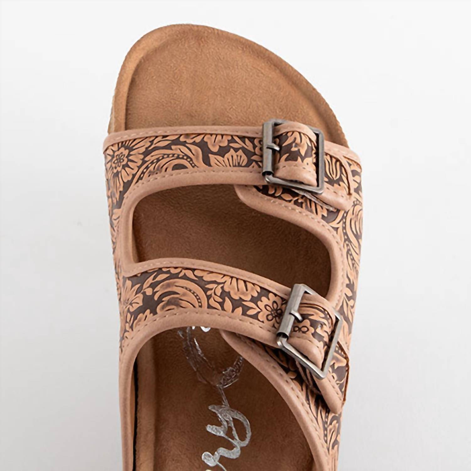Introducing the Women's Tanya Tooled Sandal by Very G, a standout piece in light tan perfect for adding a Western flair to your summer wardrobe. With an open-toe design and dual adjustable buckles, these sandals offer both style and comfort. The breezy cork footbed ensures all-day ease, making them ideal for a wide range of occasions from running errands to summer festivals. Enjoy effortless cowgirl style with these TikTok-famous sandals, tailored to enhance your travel experiences.