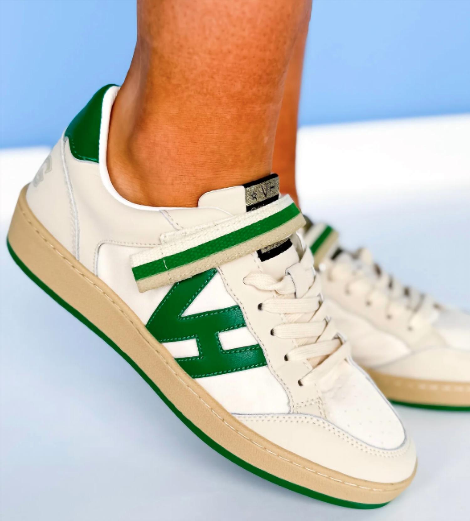Step up your summer style with the Women's Next 6 Sneakers by Vintage Havana, featuring an iconic green VH logo. Designed with a round toe and strap closure, these sneakers boast a low-top silhouette in a chic cream and green palette. The flat heel ensures comfort, while the off-white strap adds a trendy touch. Perfect for adult women seeking casual elegance, these sneakers will keep you stylishly grounded all summer long.
