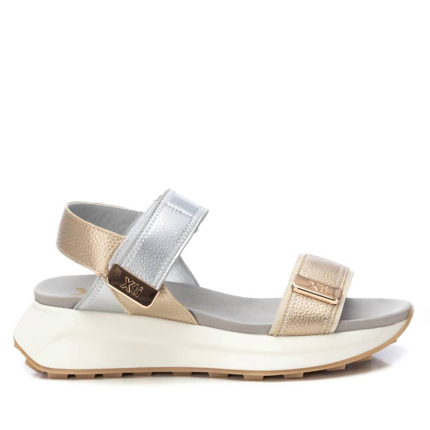 Step out in style with the Women's Casual Sandals by Xti, crafted to offer both comfort and a trendy flair. Made from faux leather with a synthetic outer fabric, these sandals feature a sporty, non-slip sole and a low wedge heel measuring 1 1/4" to 2", perfect for all-day wear. The sandals include a convenient Velcro closure with a chic metal detail, ensuring a snug fit. Proudly certified vegan by PETA, indulge in these round-toe gold sandals that promise versatility across any occasion.
