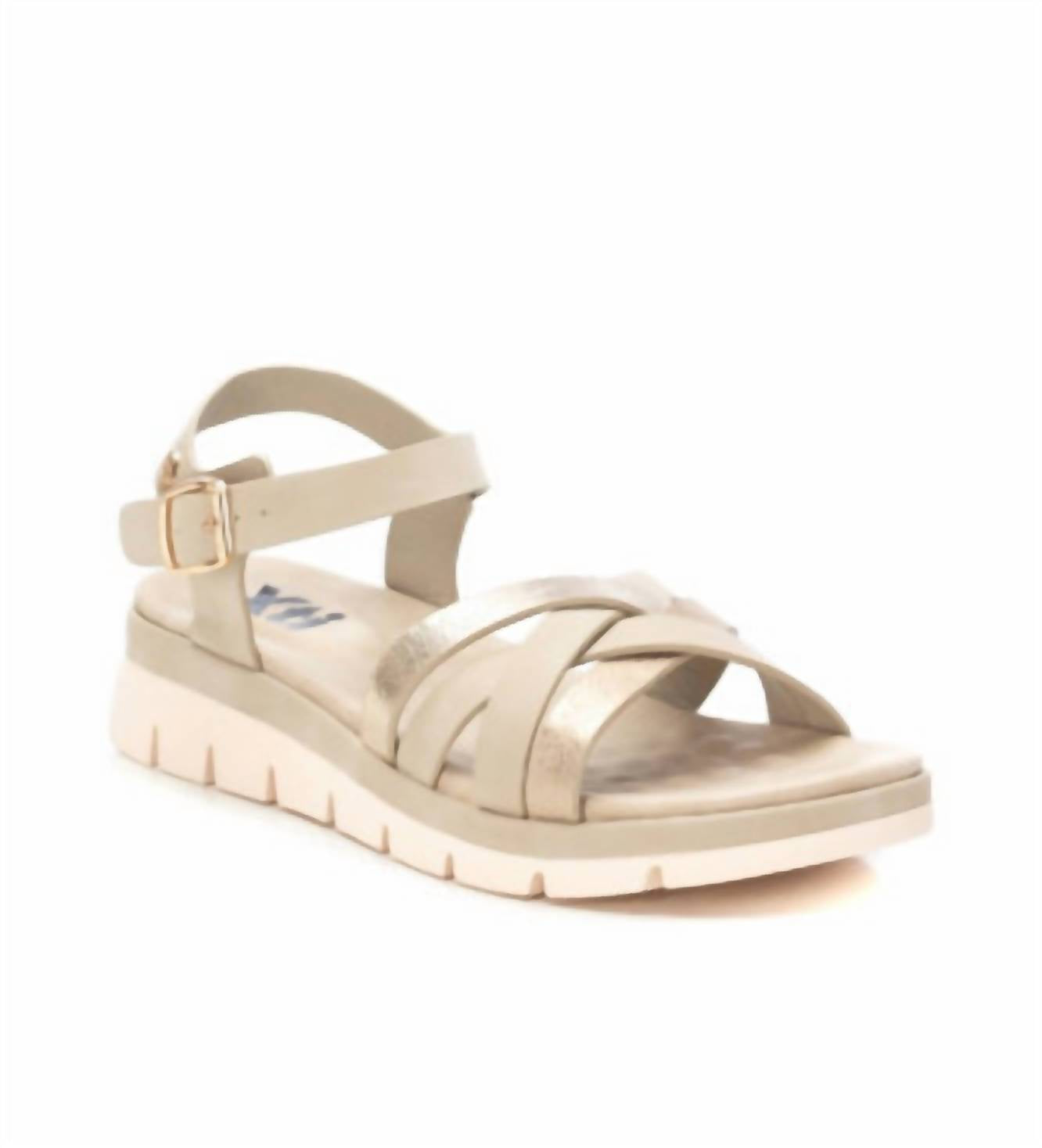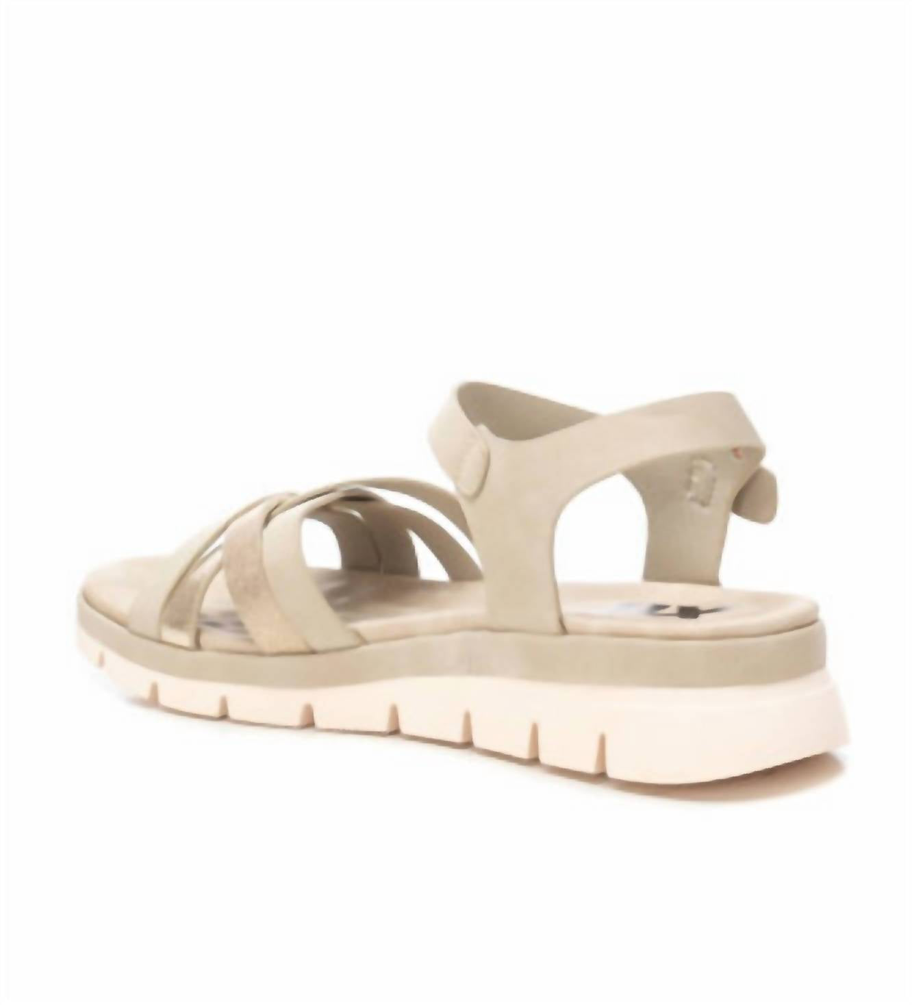 This Faux Leather Sandal features intertwined straps with a metallic finish and an ankle bracelet with a matching metallic buckle. Includes a non-slip sole and a low wedge heel for all-day wear. PETA-certified vegan, perfect for blending elegance and comfort.