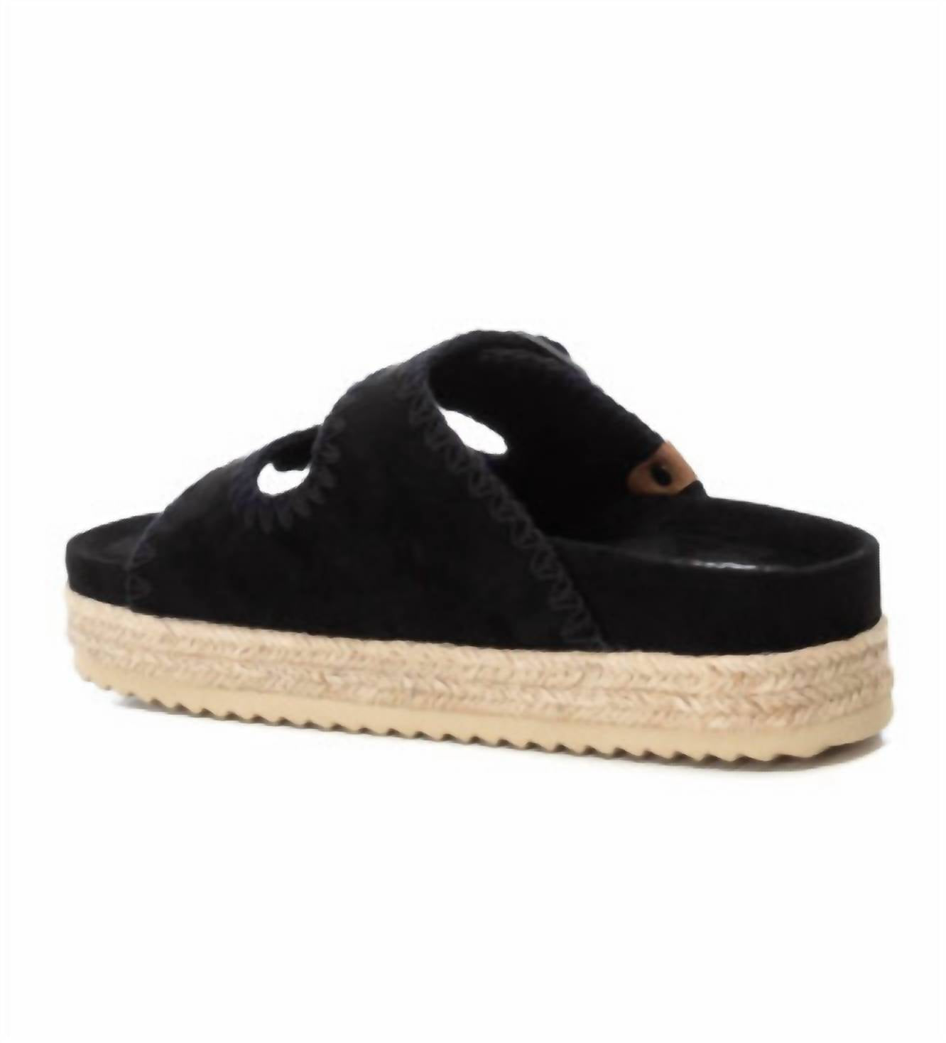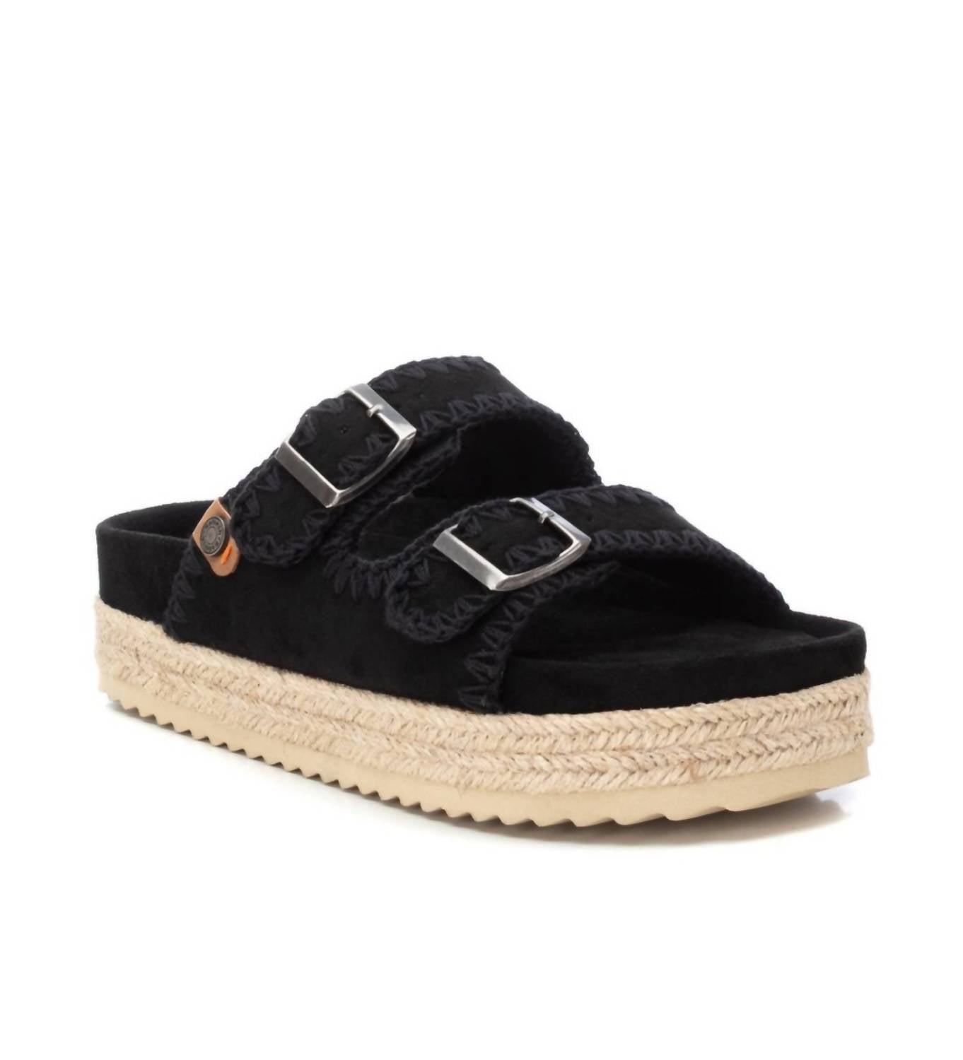 This Flat Sanda features a double shovel design with adjustable buckles for a customized fit. The bios sole is wrapped in matching suede, extending to the jute-lined, non-slip base. PETA-certified vegan. The round toe and flat heel ensure all-day comfort with classic charm.