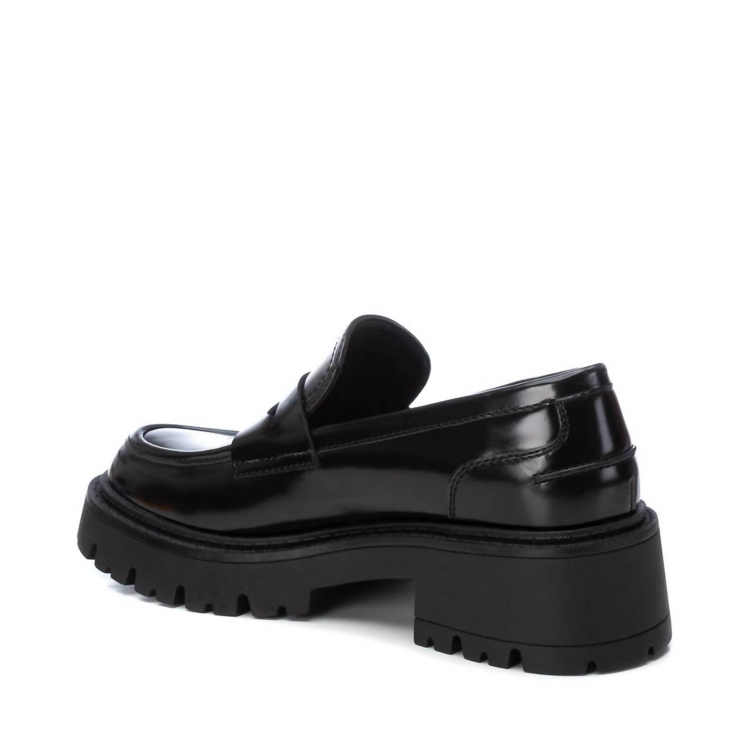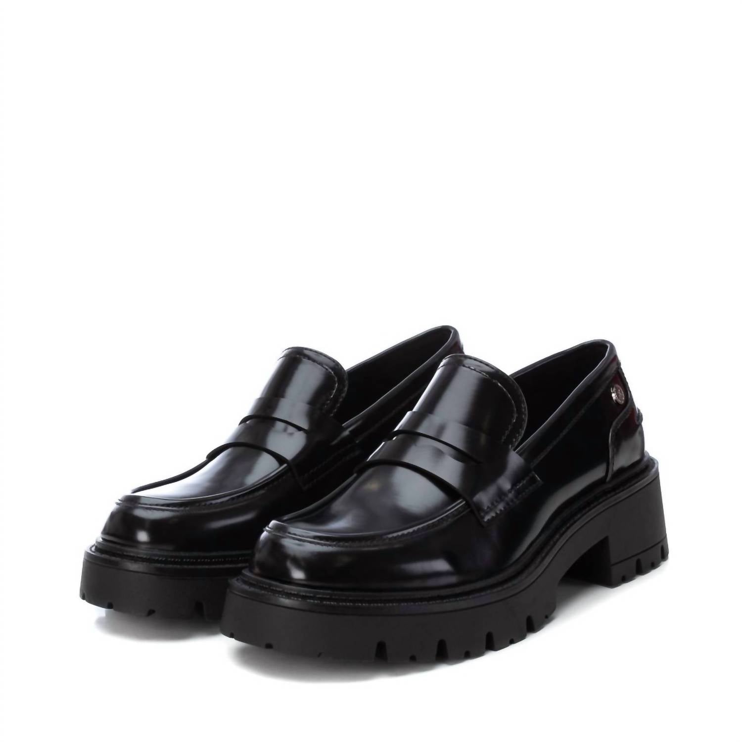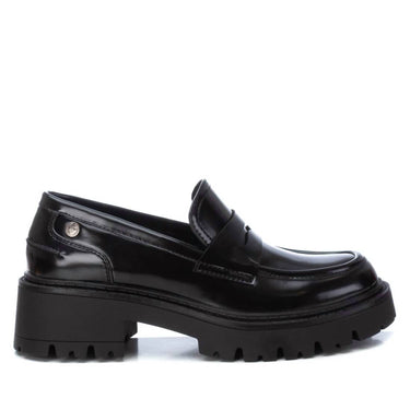 This Moccasins are crafted from sleek black faux leather with a chic patent finish and decorative die-cut design, featuring an adjustable lace closure for a perfect fit. The thick, serrated non-slip sole and mid-heel block style ensure comfort and versatility, while being certified vegan by PETA for an ethical choice.