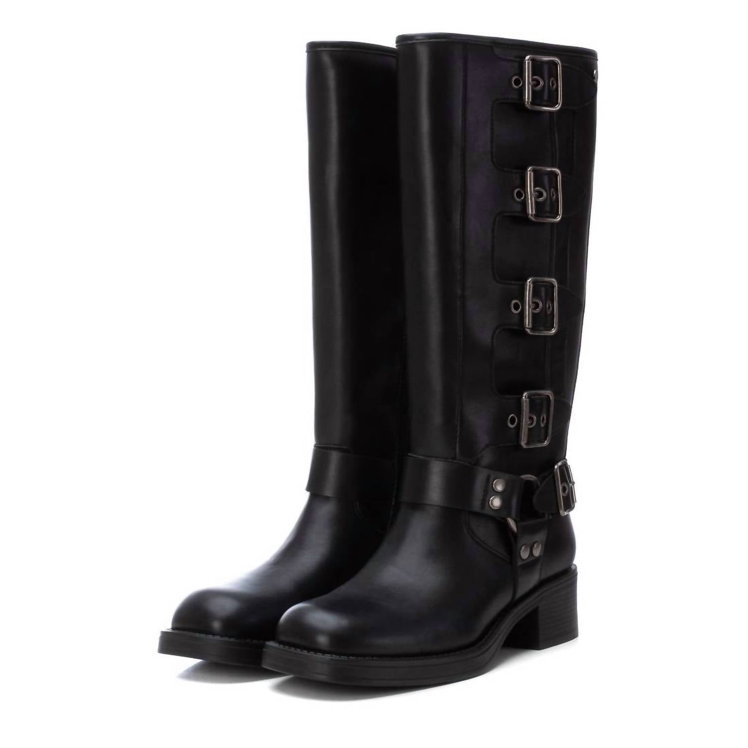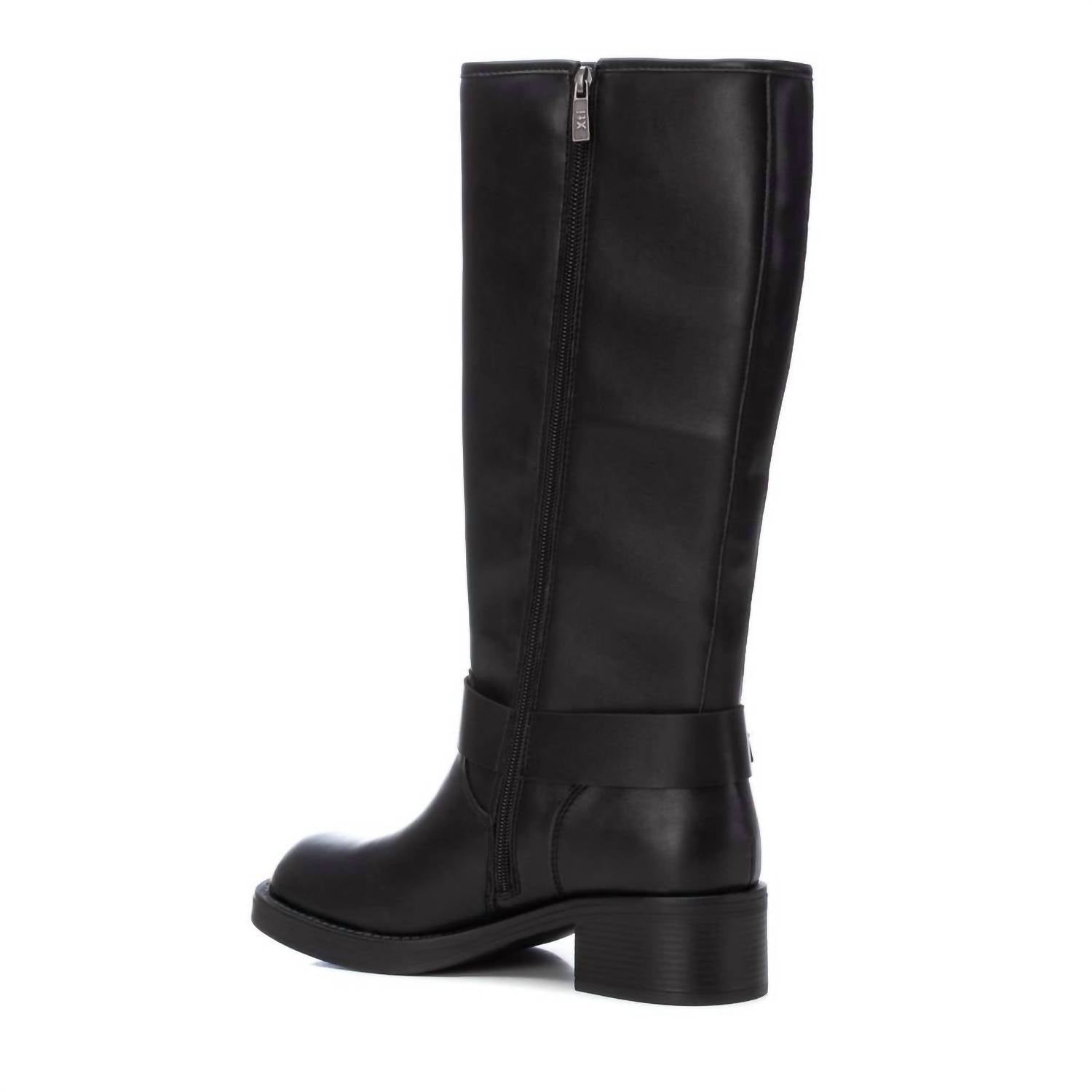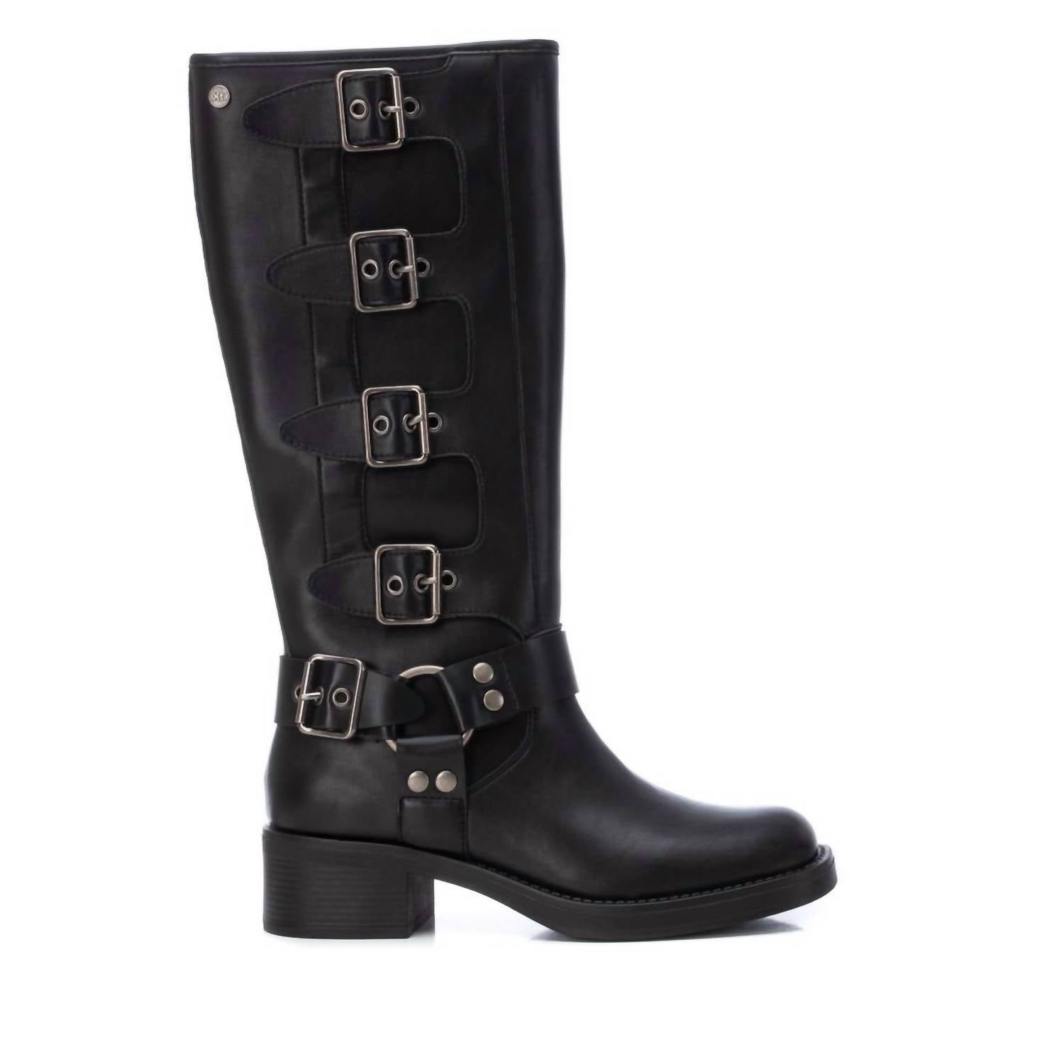Elevate your fashion with the Women's Tall Boots by Xti, crafted in elegant black faux leather. These boots showcase a musketeer style with a high cane and decorative buckles, complemented by a convenient side zip closure. Designed for comfort and style, they feature a 1.96-inch block heel and a non-slip rubber sole. The breathable material and padded insole ensure lasting comfort, making them a certified vegan choice by PETA.