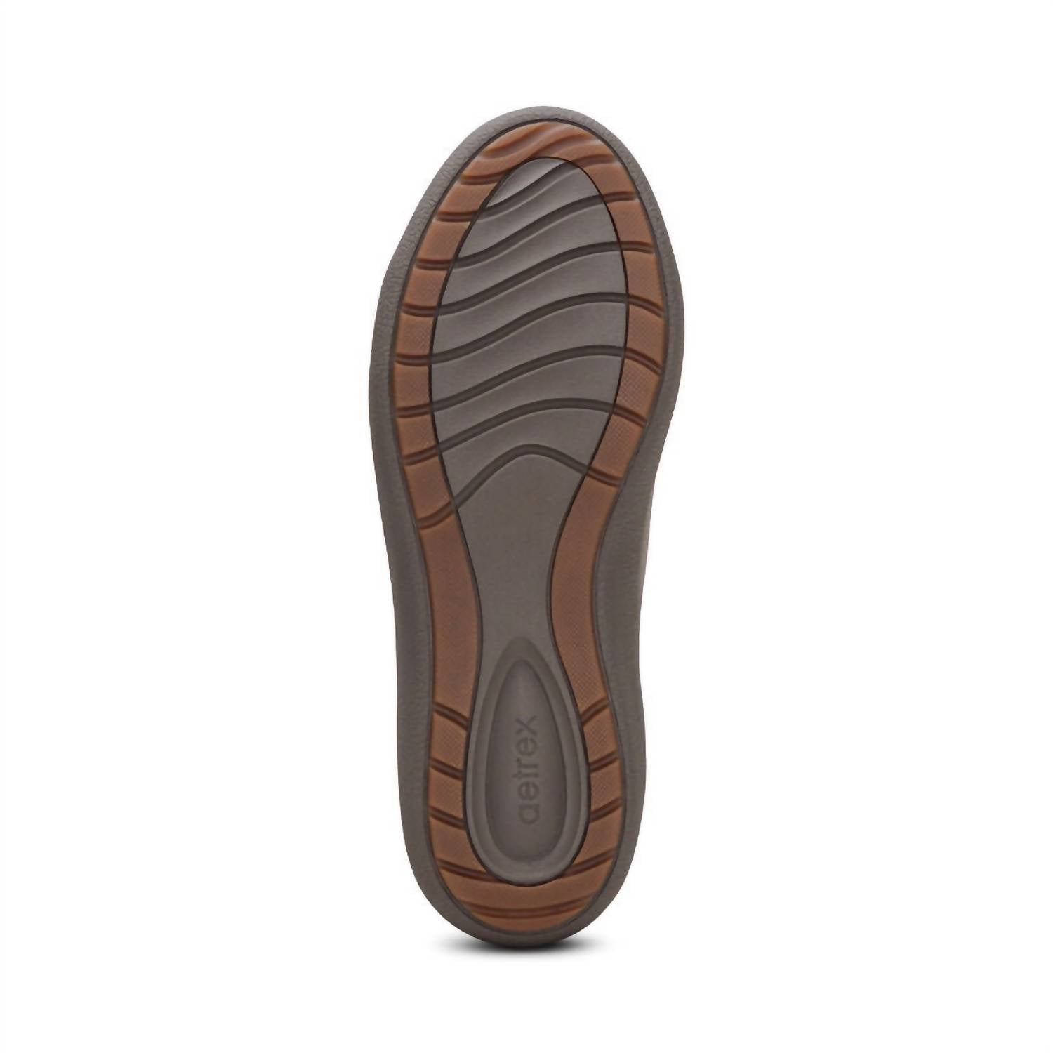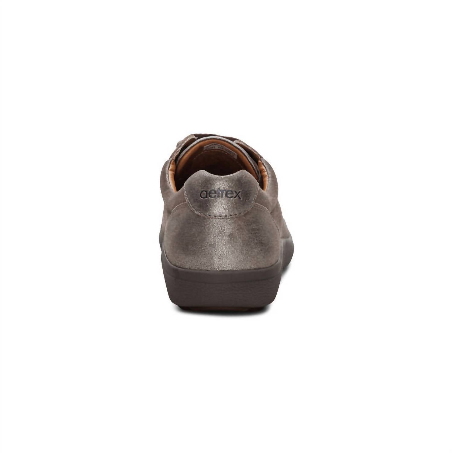 The Courtney Lace-up Sneakers by Aetrex combine durable leather construction with comfort-focused design. Featuring the Aetrex Orthotic System for arch support and UltraSky™ cushioning, these sneakers offer pressure relief and body alignment. A lightweight EVA midsole, rubber outsole, and adjustable lace-up closure provide a customized fit. Heel Height: 1.25". Available in brushed silver for versatile, all-day wear.