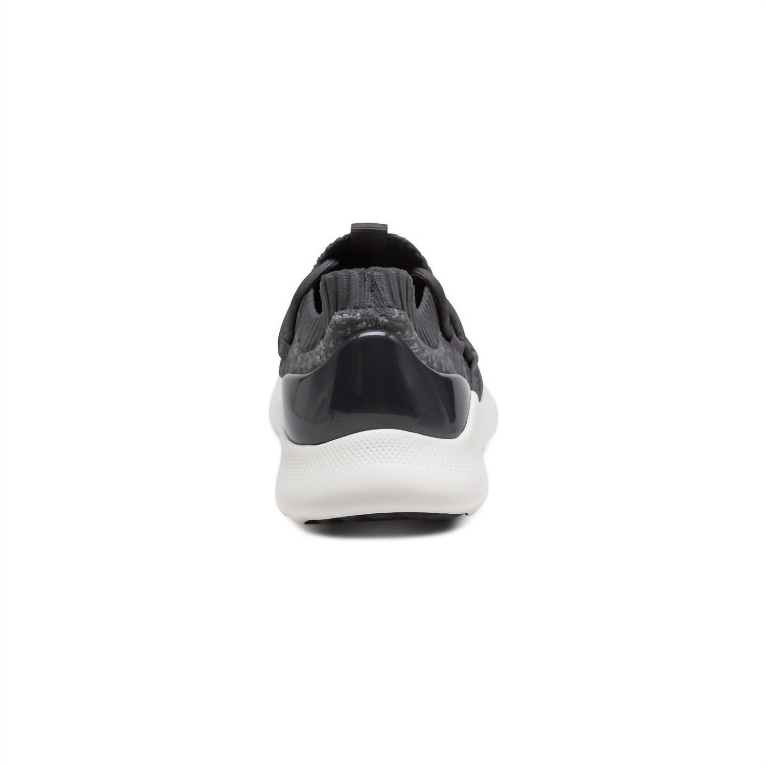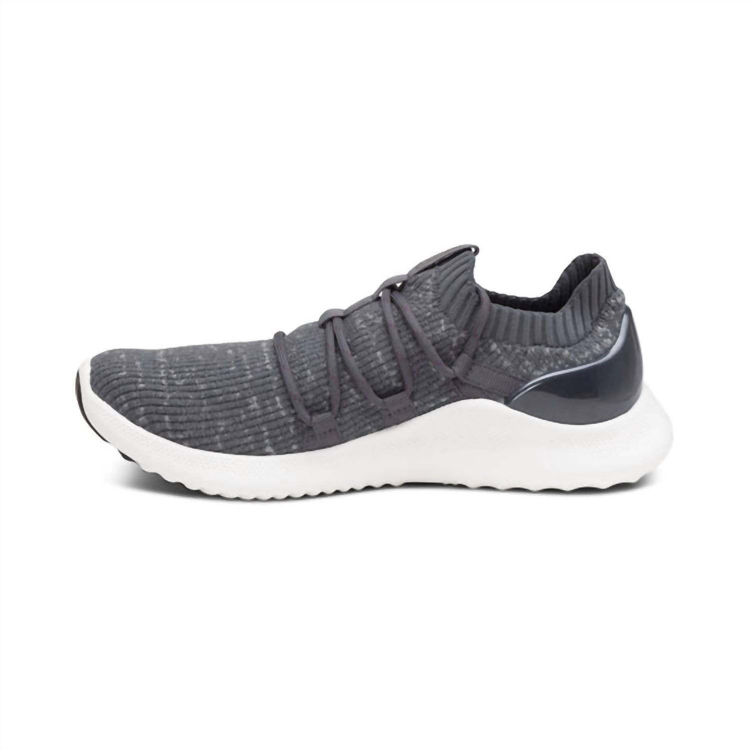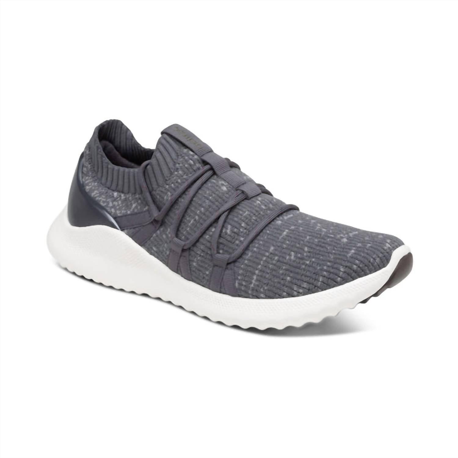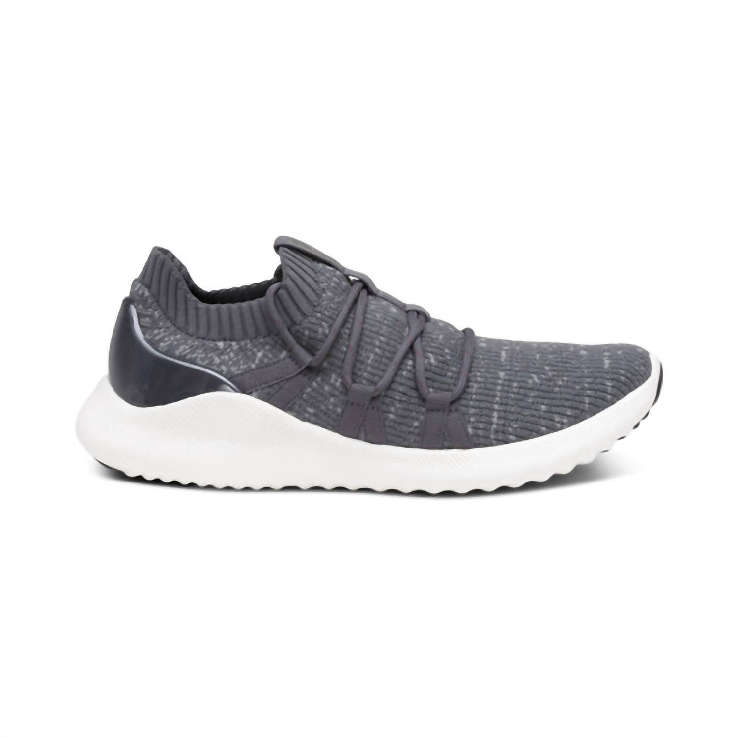 This sneaker is designed for lightweight support and all-day comfort. It features a soft, stretchy knit upper, adjustable laces, and extra heel padding, making it ideal for active use. The built-in arch support helps stabilize the feet and relieve common discomforts such as heel or arch pain, while cushioned insoles provide pressure relief and lasting comfort. A breathable lining with antimicrobial properties helps reduce odors, and durable rubber outsoles enhance traction and longevity. The insole is removable, allowing for a personalized fit.
