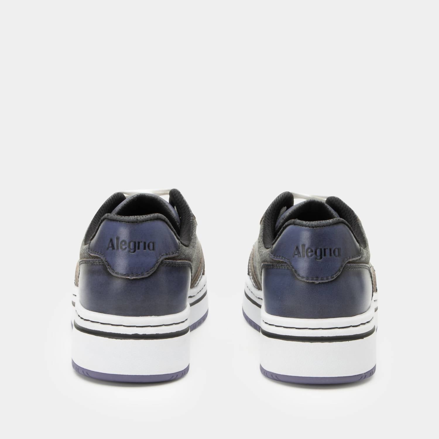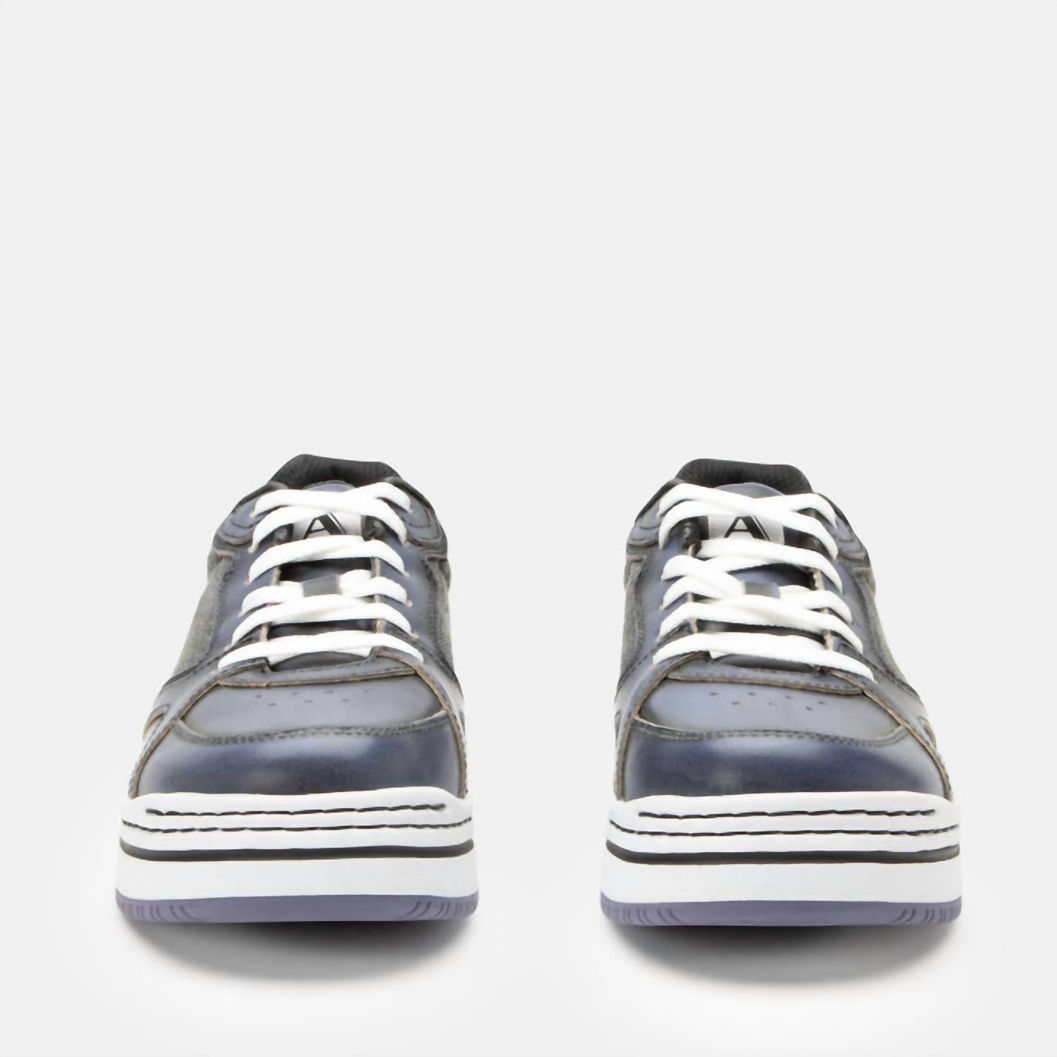 Introducing the Women's Alyster Sneakers by Alegria, a chic choice for fashion-forward individuals. With a sleek Blue Black leather and washed canvas upper, these lace-up sneakers are both stylish and practical. The round toe design and lightweight EVA rubber slip-resistant outsole offer comfort, with a low heel height of 1.5 inches providing support for your adventures. Perfect for those seeking fashionable footwear that doesn't compromise on functionality.